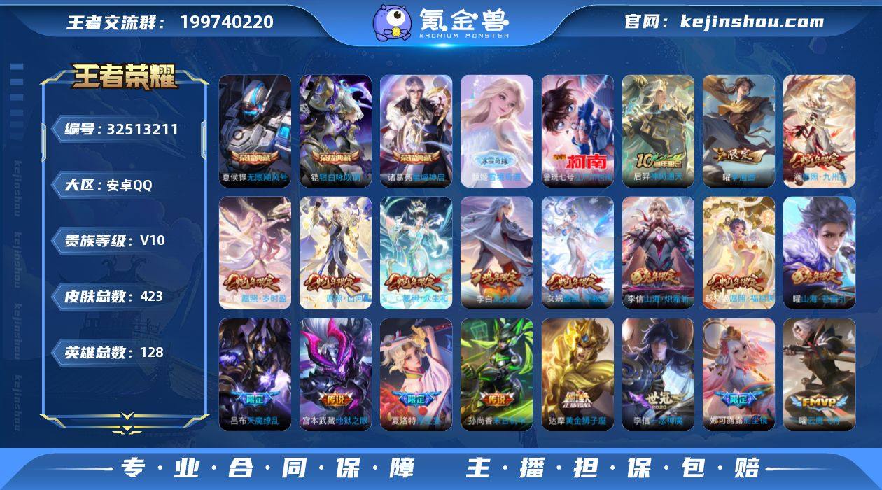 【aswz1575】安卓Q-V10-最强王者段位-128英雄-423皮肤-3典藏皮肤-1典藏英雄-1无双-1珍品传说-44传说-136史诗 【英雄全皮】:姜子牙全皮,孙权全皮,娜可露露全皮,夏洛特全皮,空空儿全皮,影全皮 【荣耀典藏】:武则天英雄,夏侯惇无限飓风号,诸葛亮星域神启,铠银白咏叹调 【无双皮肤】:甄姬雪境奇遇 【珍品传说】:鲁班七号江户川柯南 【传说皮肤】:后羿神树通天,司空震愿照山河定,女娲愿照千秋盛,妲己愿照众生和,澜愿照九州拓,蔡文姬愿照福禄聚,虞姬愿照岁时盈,云缨幻光神枪,艾琳觅芳踪,东皇太一灼幽烈阳,澜电玩雷克斯,亚瑟追逃游戏,夏洛特浮生妄,花木兰燃星之曲,伽罗炽翼辉光,孙悟空齐天大圣,曜山海苍雷引,李信山海炽霜斩,狄仁杰神器狴犴令,王昭君星穹之声,娜可露露前尘镜,后羿无尽星芒,孙策挚爱之约,蔡文姬花朝如约,孙尚香异界灵契,赵云淬星耀世,曜李逍遥 ,铠绛天战甲,虞姬启明星使,曜云鹰飞将,李信一念神魔,貂蝉猫影幻舞,张良黄金白羊座,干将莫邪久胜战神,达摩黄金狮子座,后羿黄金射手座,貂蝉仲夏夜之梦,李白凤求凰,孙尚香末日机甲,宫本武藏地狱之眼,孙悟空地狱火,吕布天魔缭乱,武则天海洋之心,狄仁杰超时空战士 【限定...