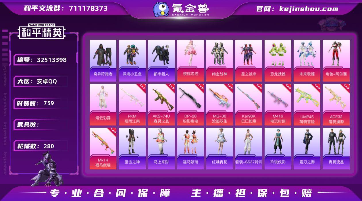 实名: 可修改 时装数: 759 枪械数: 280 战备数: 240 热门装扮: 奇异狩猎者,深海小丑鱼,鹰眼刺客,都市猎人,绚金战神,星之彼岸,恐龙拽拽,未来歌姬,阿尔茜,烟云彩露,樱桃泡泡 稀有枪皮: PKM江南烟雨,M416电玩时刻,Kar98K-巳巳如意,DP-28-豹影疾电,MG-36-沧焰双生,AKS-74U-森灵之息,ACE32-萌骑漫游,UMP45-萌骑冒险