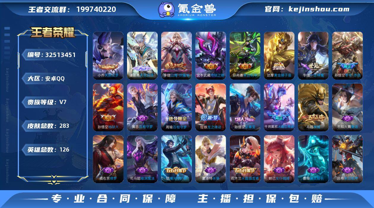 【WZYH955】贵族7/皮肤283/典藏1/传说8/史诗72/英雄126/孙权全皮/鬼谷子全皮/影全皮/小乔-天鹅之梦/天机白泽/后羿神树通天/李信-山海·炽霜斩/孙悟空-零号·赤焰/李信-一念神魔/达摩-黄金狮子座/孙尚香-末日机甲/宫本武藏-地狱之眼/孙悟空-地狱火/白起-狰/蔡文姬-夏日便利店/虞姬-夏日便利店/姜子牙-天穹之誓/狄仁杰-阴阳师/赵云-皇家上将/墨子-神迹守卫/庄周-高山流水/高渐离-死亡摇滚/高渐离-玩趣恶龙/阿轲-迷踪丽影/钟无艳-王者之锤/白起-夜都怪侠/芈月-重明/元歌-云间偶戏/元歌-无心/夏侯惇-朔风刀/甄姬-游园惊梦/曹操-烛龙/典韦-穷奇/狄仁杰-魔术师/狄仁杰-万华元夜/达摩-星际陆战队/达摩-沙漠行僧/项羽-海滩派对/老夫子-醍醐杖/老夫子-航海奇遇记/程咬金-演武夺筹/刘邦-夺宝奇兵/王昭君-午后时光/兰陵王-金庭之子/亚瑟-潮玩骑士王/孙悟空-至尊宝/孙悟空-孙行者/牛魔-御旌/李元芳-云中旅人/钟馗-驱傩正仪/杨玉环-遇见飞天/干将莫邪-冰霜恋舞曲/雅典娜-黎明之约/蔡文姬-繁星吟游/太乙真人-饕餮/太乙真人-华丽摇滚/鬼谷子-原初探秘者/鬼谷子-五谷丰年/铠-青龙志/苏烈-千军破阵/百里玄策-原初追逐者/弈星-混沌棋/梦奇-顽趣/沈梦溪-大漠名商/明世隐-疑决卦/裴擒虎-李小龙/裴擒...