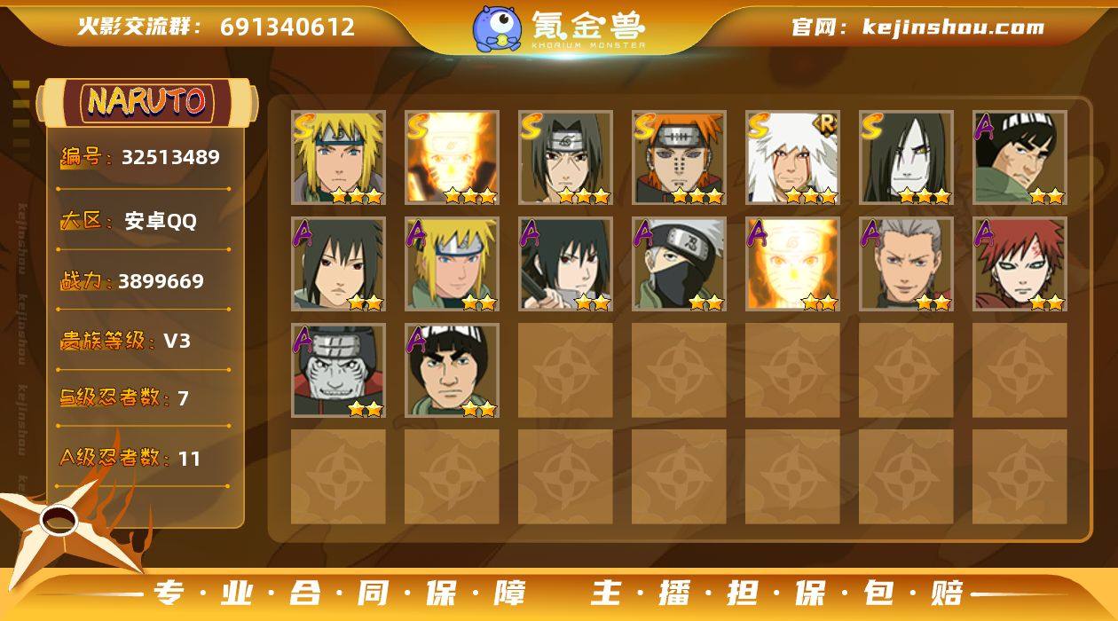 7S忍/11A忍/战力389W/V3/区服2877 【S忍者】 宇智波佐助「漩涡鸣人」,漩涡鸣人「九喇嘛连结」,自来也「舞之豪杰」,宇智波鼬「须佐能乎」,佩恩「天道」,波风水门,大蛇丸, 【A忍者】 小南「神驹佑将」,迈特凯「青春爆炸」,宇智波泉奈,波风水门「青年」,宇智波佐助「须佐能乎」,旗木卡卡西「忍界大战」,漩涡鸣人「九尾查克拉」,飞段,我爱罗「疾风传」,干柿鬼鲛,迈特凯, PX_2514383