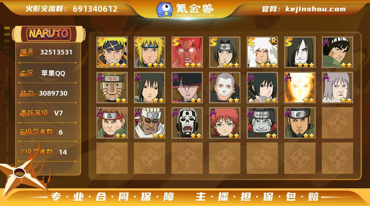 IOS/6S忍/14A忍/战力308W/V7/区服564 【S忍者】 宇智波佐助「漩涡鸣人」,迈特凯「死门」,自来也「舞之豪杰」,宇智波鼬「须佐能乎」,波风水门,大蛇丸, 【A忍者】 佩恩·六道「漂泊浪客」,机械鸣人「初始形态」,迈特凯「青春爆炸」,宇智波泉奈,飞段「恶灵之影」,宇智波佐助「须佐能乎」,漩涡鸣人「九尾查克拉」,千代「近松十人卫」,秋道丁次「忍界大战」,奇拉比,飞段「死司凭血」,蝎,干柿鬼鲛,猿飞阿斯玛, PX_2509516