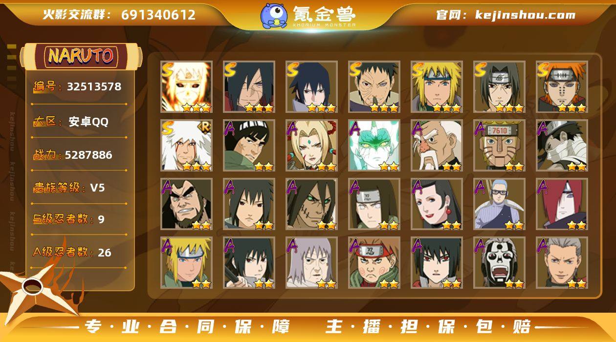 9S忍/26A忍/战力528W/V5/区服1266 【S忍者】 宇智波佐助「漩涡鸣人」,宇智波斑「秽土转生·解」,宇智波佐助「永恒万花筒」,宇智波带土「忍界大战」,自来也「舞之豪杰」,宇智波鼬「须佐能乎」,佩恩「天道」,波风水门,波风水门「九喇嘛连结」, 【A忍者】 小南「神驹佑将」,机械鸣人「初始形态」,大野木「侠隐江湖」,纲手「妖怪奇谭」,巳月「仙人模式」,迈特凯「青春爆炸」,长十郎「六代目水影」,不缘,日向宁次「忍界大战」,宇智波泉奈,神农「羁绊」,桃地再不斩「秽土转生」,角都「秽土转生」,长门「青年」,波风水门「青年」,宇智波佐助「须佐能乎」,千代「近松十人卫」,秋道丁次「忍界大战」,宇智波佐助「万花筒写轮眼」,飞段「死司凭血」,飞段,我爱罗「疾风传」,蝎,干柿鬼鲛,猿飞阿斯玛,迈特凯, PX_2512906