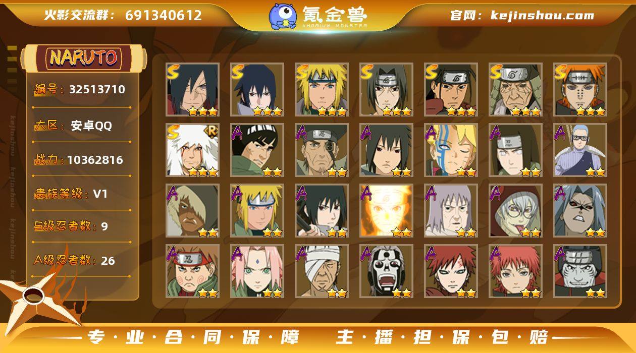 9S忍/26A忍/战力1036W/V1/区服3321 【S忍者】 宇智波佐助「漩涡鸣人」,宇智波斑「秽土转生·解」,宇智波佐助「永恒万花筒」,自来也「舞之豪杰」,猿飞日斩「秽土转生」,千手柱间,宇智波鼬「须佐能乎」,佩恩「天道」,波风水门, 【A忍者】 小南「神驹佑将」,迈特凯「青春爆炸」,土台「忍界大战」,长十郎「六代目水影」,日向宁次「忍界大战」,漩涡博人「桃式显现」,宇智波泉奈,达鲁伊「五代目雷影」,波风水门「青年」,宇智波佐助「须佐能乎」,漩涡鸣人「九尾查克拉」,千代「近松十人卫」,药师兜「半蛇斗篷」,宇智波佐助「疾风传咒印」,秋道丁次「忍界大战」,春野樱「百豪」,志村团藏,飞段「死司凭血」,我爱罗「疾风传」,蝎,干柿鬼鲛,宇智波鼬,猿飞阿斯玛,迈特凯,桃地再不斩, PX_2514170