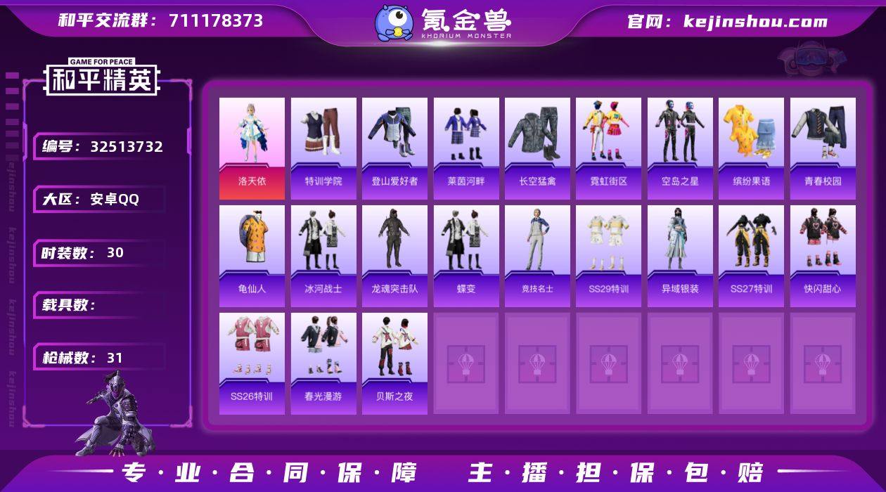 HX9230【角色-洛天依-7王牌印记-游戏等级56-女号】安卓 手Q-1粉装-0特效枪-0载具-0粉色飞行器-10094热力值-7王牌印记-31套装-31枪皮 【热门品类】:套装-龟仙人 【粉色套装】:角色-洛天依 【稀有套装】:套装-龟仙人,套装-星渊小夜曲 【稀有枪皮】:AKM-彩虹符号,M416-糯团青竹,G36C-星穹咏叹调,AC-VAL-快闪甜心,蜜獾-天降萌叽,UZI-啾咪啾咪,UZI-天降萌叽,汤姆逊-天降萌叽,P90-快闪甜心,Kar98K-彩虹符号,AWM-圣堂之誓,20-H-快闪甜心,沙漠之鹰-快闪甜心 【其他套装】:套装-SS26特训,套装-SS27特训,套装-SS29特训,套装-特训学院,套装-登山爱好者,套装-空岛之星,套装-竞技名士,套装-缤纷果语,套装-长空猛禽,套装-霓虹街区,套装-青春校园,套装-龟仙人,套装-莱茵河畔,套装-快闪甜心,套装-安卓Q区-1粉装-10094热力值-7王牌印记-31套装-31枪皮【优质套装】: 洛天依【稀有武器皮肤】: DBS-乌木金纹 SCAR-L-海盐豹豹 GROZA-海盐豹豹 Mk14-冰河战士 UZI-冰河战士 M16A4-冰河战士 20-H-乌木金纹 蜜獾-乌木金纹 M416-糯团青竹 AKM-彩虹符号 AC-VAL-快闪甜心 蜜獾-天降萌叽 Kar98K-彩虹符号 AWM-圣堂之誓 AMR-乌木金纹 20-H-快闪甜心 UZI-天降萌叽 UZI-啾咪...