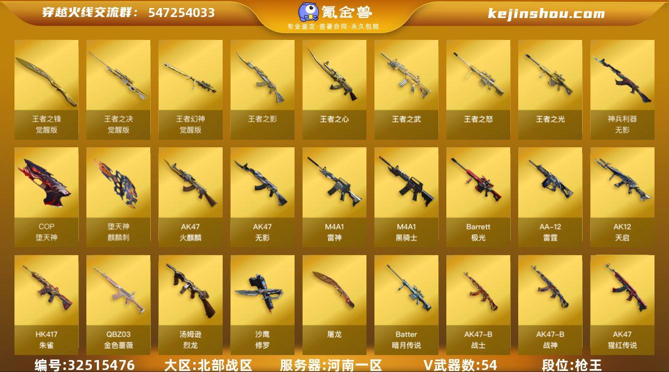 【938016】河南一区-59V-9王者武器数-0炫金武器数 【热门武器】:QBZ03-金色蔷薇,HK417-朱雀,金色小号,M4A1-黑骑士,汤姆逊-烈龙*3,羊驼玩偶,COP-堕天神,沙鹰-修罗*5 【王者炫金武器】:王者之武,王者之影,王者之心,王者之光,王者之怒*2 【音效卡】:M4A1-黑骑士音效卡*2 【皮肤】:雷神-星空,雷神-宇航兔皮肤,火麒麟-心动糖果,M4A1-千变-孔明皮肤,无影耀金皮肤,AK47-黑武士-361,战神-粉色甜心皮肤*3,战神-紫绶金章皮肤*11,战神-流金岁月皮肤*13,修罗-能量核心 【角色】:迷迭香,隼,王者玲珑,乔伊教练,空,暗夜-X,风暴女,嘉年华灵狐,灵狐者-职业经理,女主播,潜龙队-X,青霞仙子,斯沃特-X,蜀雪,铁骑荣耀,兔囡囡 【人偶武器】:USP-铃狮送福,AWM-灵狐-15周年嘉年华,COP-旗袍,迷你深渊冰龙*2,夺魂,迷你生化手雷,闪光弹-小乔 【挑战大师】:AK47-冰龙粉碎者,阐释者III 【英雄级武器】:AK47-火麒麟,M4A1-雷神,M4A1-黑骑士,AK47-无影,AK12-天启,HK417-朱雀,无影-神兵利器,QBZ03-金色蔷薇,烈火-动感闪耀,AK-47-猩红传说*14,AK47-B-战神,AK47-B-战士,Barrett-极光,王者之决-觉醒版,王者幻神-觉醒版,Barrett-暗月传说,汤姆逊-...