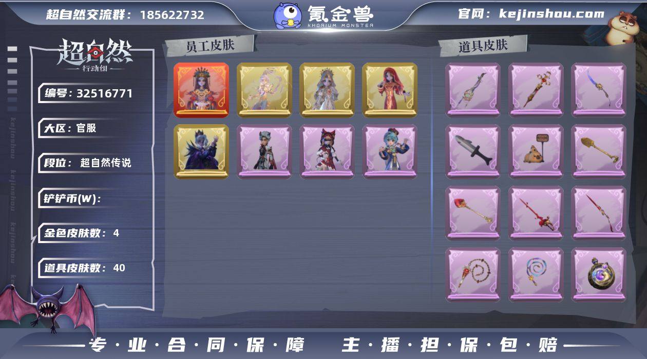 ZR209 段位:超自然传说 红色皮肤数量:1 金色皮肤数量:4 紫色皮肤数量:4 道具皮肤数量:40 铲铲币:36290000 累充:35760金砖 赛季魔盒:稀世豪华魔盒 员工:小黄 爱丽丝 零 阿念 逍遥 薇薇安 巫铃儿 莉莉 艾伦 爱德华 兰 小满 外观:镜生遗梦 渡鸦公爵 莲华渡 圣光之谕 镜花辞 黎明猎手 莓果陷阱 迷途僵宝 青云逸歌 道具:龙鳞 星寂 绯色遗证 冬夜暖忆 祝祷词 happy猫 凤鸣九天 金丝眼镜 伏妖塔 弦外之音 私藏的银河 末章心跳 惊魂娃娃 飞天绫 飞花令 卡皮巴拉小黄豚铲 紫气东来 蔷薇物语 小鲨匕首 赞萌露比水枪 缚誓之锁 青玉抱丹 昆仑镜 圣心之泪 乘风溯雪 逆时审判 月下莲台 宝剑八 子夜证词 蜜蜂线索 兜风日程 寻凉记 班卓琴 晚安仪式 白鼬趴趴 潮汐小海兔 天使的呼唤 蝶恋花 美妆:暗夜小恶魔 载具:惊奇万圣涂装 头饰:太空鲨头套 雪墩墩头套 蒜了八 樱桃奶油布丁 精致露比头套 小财神豚豚头套 鱼头怪头套 烈焰红唇头套 面具马头套 哈士奇头套 萨卡班甲鱼头套 嘻嘻头套 滑稽头套 呆滞头套 卑微头套 像素朋克墨镜 后室幸存者头套 挂饰:尘封旧事 天使消失的年代 钗头凤 糖果守卫 动作:蝴蝶步 孤身摇 知世摇 鹏友摇 心跳摇 伤心摇 舞台中心 九万字舞 带你逃跑吧 举牌...