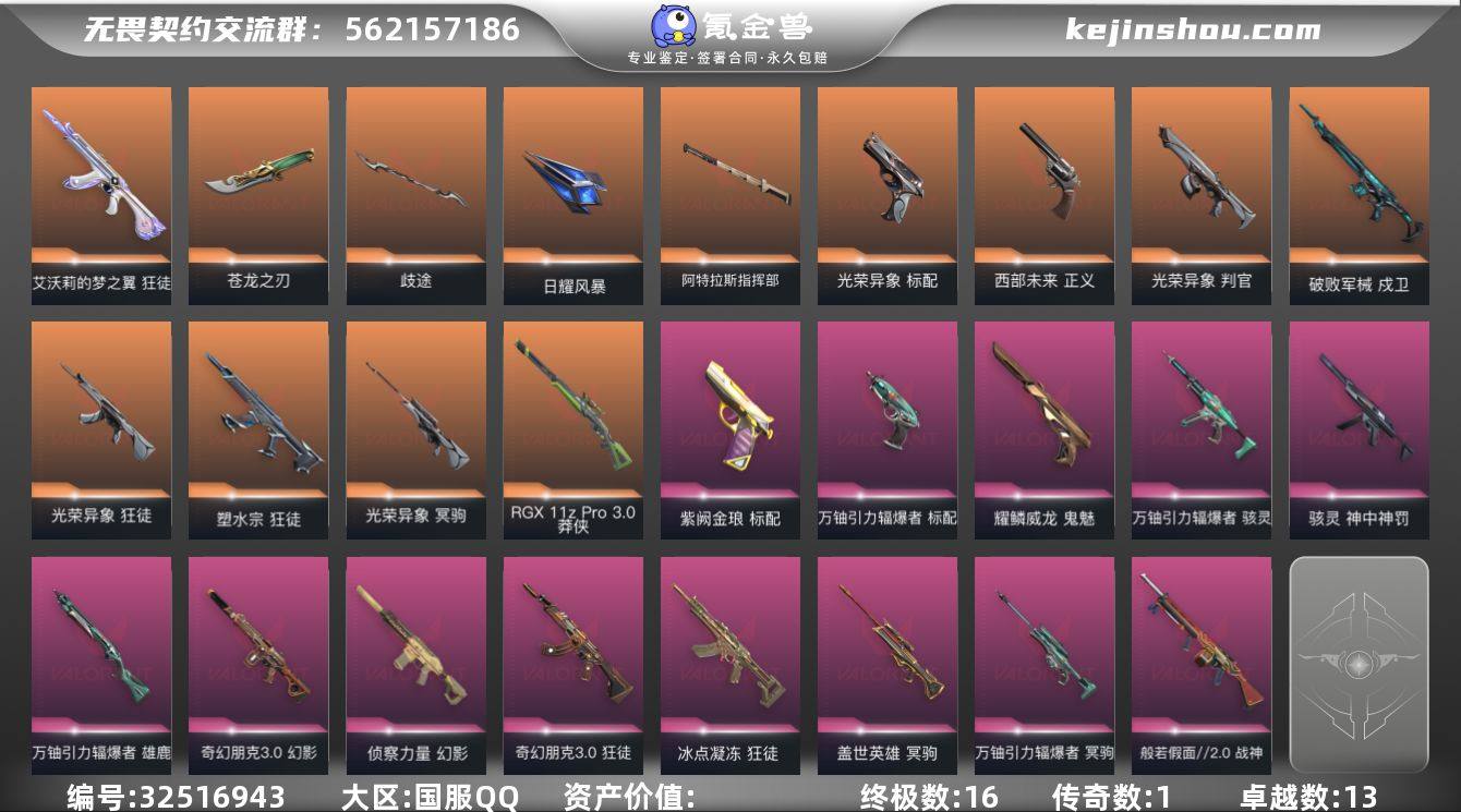 【WWC1724】终极*16/传奇*1/卓越*13/皮肤*55/等级*101/段位:未定级/光荣异象/万铀引力辐爆者/幻棱/炼狱/暮蝶/壹决/铁臂/捷风/雷兹/幽影/不死鸟/贤者/猎枭/蝰蛇/零/芮娜/奇乐/尚勃勒/霓虹/斯凯/夜露/星礈/K/O/盖可/黑梦/钢锁/魔术火花/苍龙之刃/光荣异象 歧途/镭切/辐爆之杖/天界荣光/日耀风暴/阿特拉斯指挥部/狂徒-塑水宗/狂徒-光荣异象/狂徒-艾沃莉的梦之翼/狂徒-冰点凝冻/奇幻朋克3.0狂徒/幻影-侦察力量/幻影-奇幻朋克3.0/戍卫-破败军械/冥驹-光荣异象/冥驹-盖世英雄/冥驹-万铀引力辐爆者/莽侠-RGX 11z Pro 3.0/战神-般若假面//2.0/判官-光荣异象/雄鹿-万铀引力辐爆者/骇灵-神中神罚/骇灵-万铀引力辐爆者/标配-光荣异象/标配-紫阙金琅/标配-万铀引力辐爆者/正义-西部未来/鬼魅-耀鳞威龙/树懒大作战 卡面/比比看谁快? 卡面/无垠星环 卡面/《双城之战》金克丝 卡面/代号红色 卡面/新兵报到 卡面/V契约 卡面/无畏契约 卡面/霓光四射 喷漆/买装还是存钱 喷漆/关门放狗 喷漆/暴走萝莉 喷漆/放下武器 喷漆/胜利属于无畏契约 喷漆/GLHF 喷漆/无畏契约 喷漆/薰衣草之心挂饰/动力机箱 挂饰/双城之战魄罗挂饰/无畏契约 纪念币 挂饰