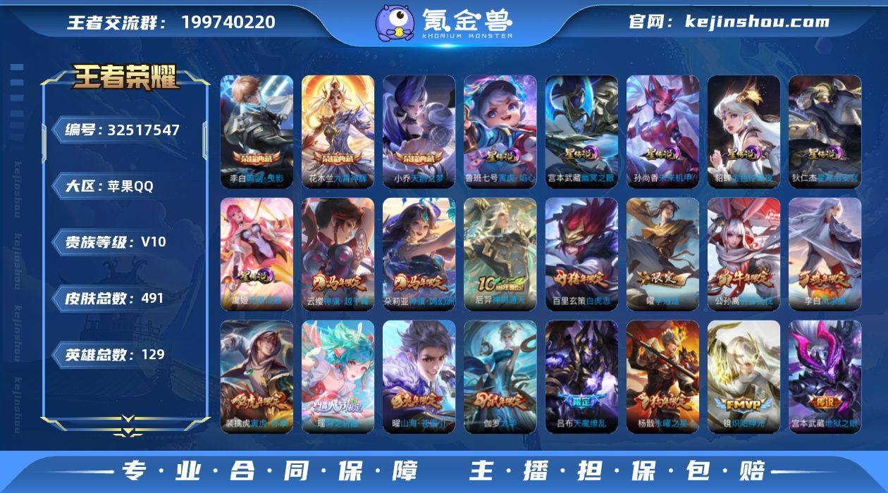 "花木兰李白小乔典藏!马年云缨!马年朵丽亚!李逍遥!白虎志!武陵仙君!永曜之星!至尊宝!【店长推荐 特价出售 永久包赔】js1664-苹果Q-V10-最强王者段位-129英雄-491皮肤-3典藏皮肤-1典藏英雄-56传说-199限定-6星元无限倾慕 寅虎.焰心 幽冥之眼 星际治安官 未来机甲 金色仲夏夜-1天幕-165史诗 【英雄全皮·10】:刘邦全皮,孙权全皮,钟馗全皮,狂铁全皮,盾山全皮,猪八戒全皮,敖隐全皮,金蝉全皮,戈娅全皮,空空儿全皮 【荣耀典藏·4】:武则天英雄,小乔天鹅之梦,李白鸣剑曳影,花木兰九霄神辉 【传说皮肤·56】:云缨神骥越千峰,朵莉亚神骥鸣幻洲,后羿神树通天,云缨幻光神枪,桑启鸣野蒿,艾琳觅芳踪,东皇太一灼幽烈阳,公孙离记忆之芯,虞姬无限倾心,项羽无限倾心,曜山海苍雷引,李白诗剑行,马超无双飞将,大乔挚爱花嫁,孙策挚爱之约,女娲补天,瑶时之祈愿,裴擒虎寅虎赤拳,鲁班七号寅虎瑞焰,孙尚香异界灵契,貂蝉遇见胡旋,赵云淬星耀世,王昭君乞巧织情,西施游龙清影,曜李逍遥 ,周瑜音你心动,小乔音你心动,李元芳飞鸢探春,公孙离祈雪灵祝,诸葛亮时雨天司,铠绛天战甲,镜炽阳神光,虞姬启明星使,孙悟空零号赤焰,曜云鹰飞将,李信一念神魔,...