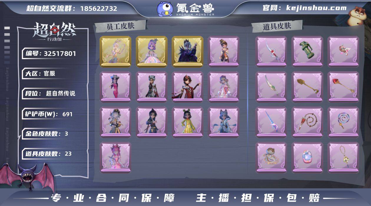 ZR498 段位:超自然传说 红色皮肤数量:0 粉色皮肤数量:0 金色皮肤数量:3 紫色皮肤数量:10 道具皮肤数量:23 铲铲币:6910000 铲铲币(单位W):691 累充:13960金砖 赛季魔盒:稀世豪华魔盒 员工:小黄 爱丽丝 零 阿念 逍遥 薇薇安 巫铃儿 莉莉 艾伦 爱德华 兰 小满 临云 外观:零 渡鸦公爵 逍遥 莲华渡 小黄 遗失的童话 艾伦 黎明猎手 阿念 庆宴绮愿 爱丽丝 耀眼的你 薇薇安 仙锋小姐 爱丽丝 甜梦派对 莉莉 除妖小师妹 小黄 青丘一梦 莉莉 情公主 逍遥 绣春逍影 小黄 呱呱雨衣 道具:铲子 圣心之泪 长鞭 小狗蛇点点鞭 电击枪 甜蜜泡泡枪 长鞭 缚誓之锁 长鞭 飞天绫 音响 鸣沙鼓 传送按钮 幻宠之门 腰包 宝剑八 急救包 蔷薇物语 桃木剑 最后的独角兽 刺刀 铂刺与红萼 专业手电 云端梦想计划 铲子 龙鳞 刺刀 碧络琅环 腰包 惊魂娃娃 闪光弹 金戈玄铜 喷气背包 乘风溯雪 摸金符 紫霄 背饰 白鼬趴趴 背饰 梵音莲华 背饰 云梦之星 头饰:烛光纪念 太空鲨头套 雪墩墩头套 蒜了八 鱼头怪头套 烈焰红唇头套 大葱明头套 火爆了头套 面具马头套 哈士奇头套 萨卡班甲鱼头套 嘻嘻头套 滑稽头套 呆滞头套 卑微头套 龙傲天头套 像素朋克墨镜 后室幸存者头套 挂饰:九色祥鹿 未竟乐园 动...