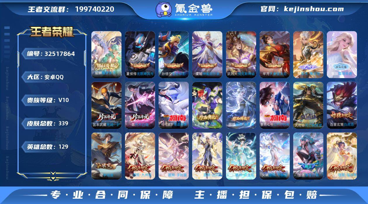 实名: 可修改 性别: 男号 贵族等级: V10 英雄数: 129 皮肤数: 339 荣耀水晶: 武则天,倪克斯神谕,无限飓风号,大秦宣太后,全息碎影,神鉴启示录 无双皮: 雪境奇遇-甄姬,器灵·螭龙剑 珍品传说: 江户川柯南,怪盗基德,时之奇旅-孙策,器灵·落星盏,朽木白哉,黑崎一护 传说皮: 黄金狮子座,黄金射手座,冠军飞将,云鹰飞将,黄金白羊座,猫影幻舞,久胜战神,炽阳神光,一念神魔,末日机甲-孙尚香,地狱火,仲夏夜之梦,地狱之眼,李逍遥,乞巧织情,时之恋人-刘备,游龙清影,淬星耀世,无双飞将,碎云,灼幽烈阳,惊梅引,遇见神鼓,鲁班七号-时之奇旅,艾琳觅芳踪,琥珀纪元铠,乘龙·问璇玑,乘龙·铭钟鼎,貂蝉曦玄引,吕布曦玄引,落雪白狼,金乌负日,铠冥王哈迪斯,玄雷天君,幻光神枪,千劫归真,续相思,死亡执政官 限定皮: 遇见飞天,李小龙,梁祝,时雨天司,玄嵩,白晶晶,幽恒,冰霜恋舞曲,逐梦之星,美猴王,白虎志,如梦令-嫦娥,武陵仙君,如梦令-后羿,大圣娶亲,霸王别姬-项羽,霸王别姬-虞姬,高山流水,猪悟能,唐三藏,枫霜尽,五谷丰年,绯月行,梦圆繁星,诗剑行,怒海麟威,冰霜神祇,齐天大圣,鸣野蒿,映山客,逐霄战戟,愿照·千秋盛,愿照·众生和,愿照·山河定,愿照·岁时盈,愿照·福禄聚,愿照·九州拓 亮点: 【优质装备】:馥梦繁花,武...