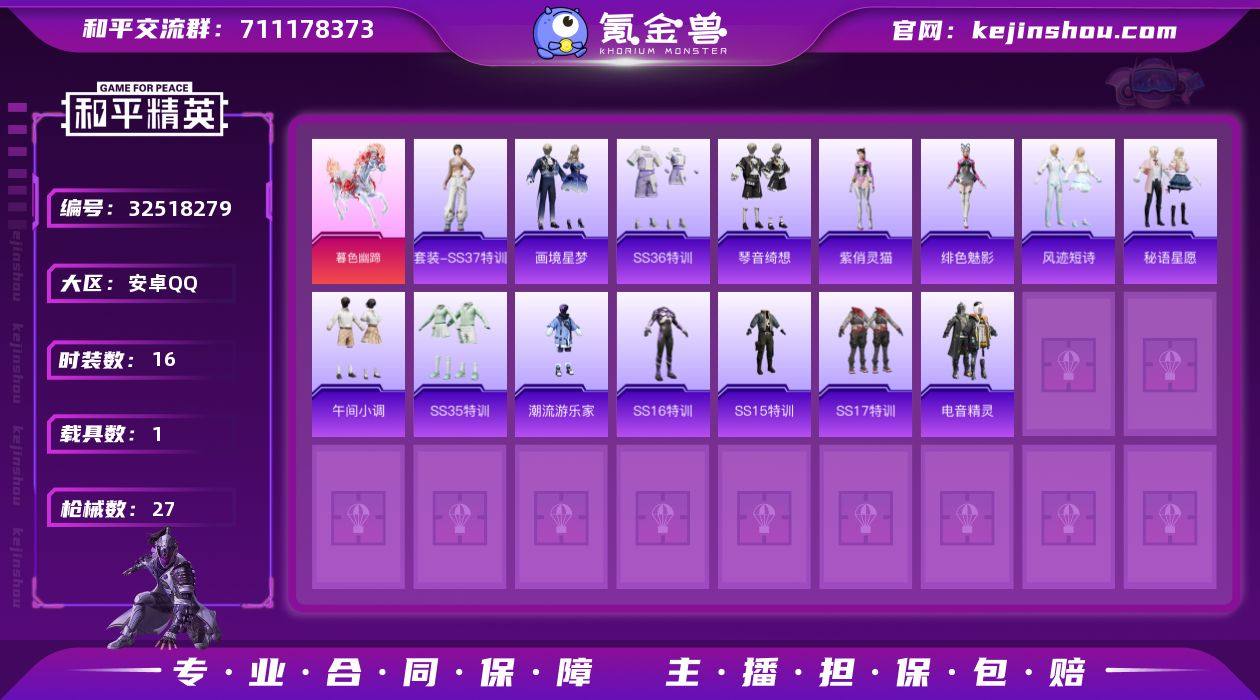 【和平精英】0粉装,3特效枪,1载具,历史最高段位:卓越王牌4星 王牌印记1次 热力值:16774,23套装,48枪械,60装备,22战备;套装:暮色玫影-艾丽娅,套装-竞技名士,套装-蓝色守护者,套装-幻世战舞者,套装-破蛋小黄鸡,套装-疯狂小兔子,套装-潮流游乐家,套装-电音精灵,套装-SS15特训,套装-SS16特训,套装-SS17特训,角色-绯色魅影,角色-紫俏灵猫,套装-炫彩糖果,套装-SS35特训,套装-午间小调,套装-秘语星愿,套装-风迹短诗,套装-琴音绮想,套装-画境星梦,套装-SS37特训,套装-SS36特训,套装-雪国风尚;枪皮:AUG-凝视深渊,AUG-青春冒险家,AUG-冰晶雪宝,Mk47-青春冒险家,Mk47-风迹短诗,3级AKM-暮色玫影,AKM-生命誓言,M416-绯红前夜,M416-红色方程式,M416-错位像素,SCAR-L-红色方程式,GROZA-彩虹符号,GROZA-暮色玫影,ACE32-画境星梦,ACE32-冰晶雪宝,AC-VAL-霁蓝缠春,蜜獾-风迹短诗,G36C-乌木金纹,Win94-乌木金纹,莫辛纳甘-风迹短诗,AWM-暮色玫影,Kar98K-红色方程式,MK12-风迹短诗,MK12-乌木金纹,M1加兰德-画境星梦,SLR-乌木金纹,QBU-青春冒险家,MK20-H-狂鲨锋刃,MP5K-怪笑疯兔,MP5K-画境星梦,汤姆逊-天降萌叽,野牛-青春冒险家,U...