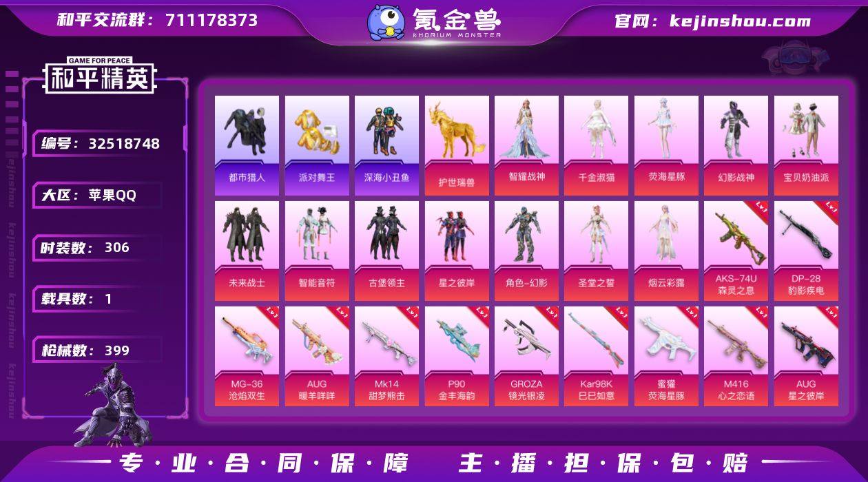【金鞋都市男神猫包17特效枪11粉装1载具素材号 秒换绑不用等】 苹果Q区-131986热力值-306套装-399枪皮 【1载具】 护世瑞兽【5稀有】 都市猎人 派对舞王(金靴子) 百万伏待背包(猫包) 冷酷挑战者 Mark.06蓝螳螂【11粉装】 宝贝奶油派 圣堂之誓 星之彼岸 幻影战神 智能音符 未来战士 古堡领主 角色-智耀战神 角色-烟云彩露 角色-荧海星豚 角色-千金淑猫【17特效枪】 M24-镜域双华(3级) M416-心之恋语(7级) AKM-炫紫旋律(7级) AKS-74U-森灵之息(5级) Mk14-福马献瑞(2级) 信号枪-金乌曜日(1级) AA12-G-萌骑幻想(5级) UMP45-萌骑冒险(4级) AUG-星之彼岸(3级) 蜜獾-荧海星豚(7级) P90-金丰海韵(7级) Kar98K-巳巳如意(5级) Mk14-甜梦熊击(5级) AUG-暖羊咩咩(5级) GROZA-镜光银凌(5级) DP-28-豹影疾电(5级) MG-36-沧焰双生(5级)【365热门】 深海小丑鱼 浪漫天命 都市猎人(蓝口罩) 雪山精英(老6服) 迅捷狂鲨 大橘为重 金羽特工 极速红龙 团圆交子 瑞龙福将 忍者信条 冰公主 白色伏地魔 SS9特训 SS6特训 SS27特训 SS26特训 SS25特训 SS24特训 SS23特训 SS22特训 SS10特训 Mini14-梦幻火箭 M762-乌木金纹 M24-未来战士 Kar98K-王子的夏天 Kar98K-电玩视界 AWM-不夜海上花 AKM-缤纷海域...