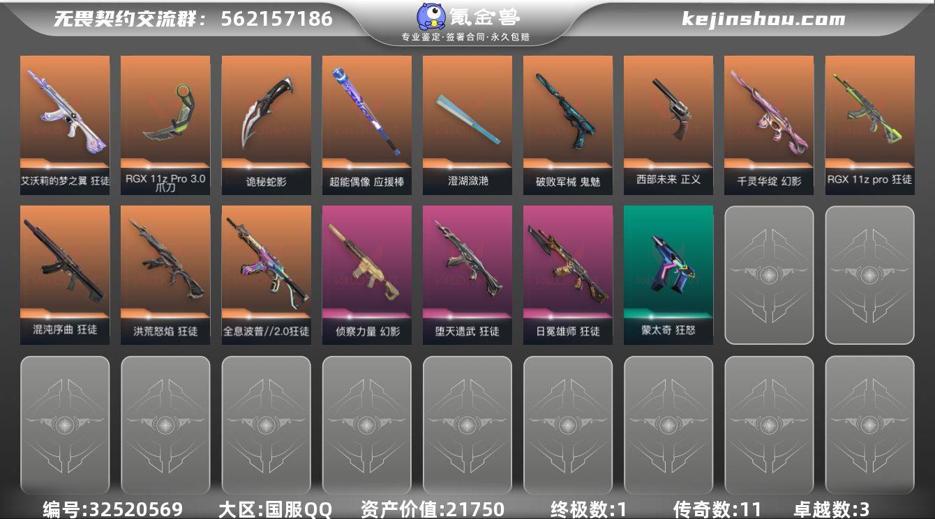 段位: 钻石 近战武器皮肤: 澄湖潋滟,超能偶像 应援棒,爪刀-RGX 11z Pro 3.0,诡秘蛇影 步枪皮肤: 幻影-侦察力量,狂徒-堕天遗武,狂徒-洪荒怒焰,幻影-千灵华绽,狂徒-日冕雄师,狂徒-艾沃莉的梦之翼,狂徒-全息波普//2.0,狂徒-混沌序曲,狂徒-RGX 11z pro 佩枪皮肤: 鬼魅-破败军械,正义-西部未来,蒙太奇 狂怒 亮点: 【优质装备】:幻影-千灵华绽,狂徒-艾沃莉的梦之翼,狂徒-混沌序曲,幻影-侦察力量,狂徒-洪荒怒焰,狂徒-日冕雄师,狂徒-全息波普//2.0,狂徒-RGX 11z pro,澄湖潋滟,鬼魅-破败军械,爪刀-RGX 11z Pro 3.0,诡秘蛇影