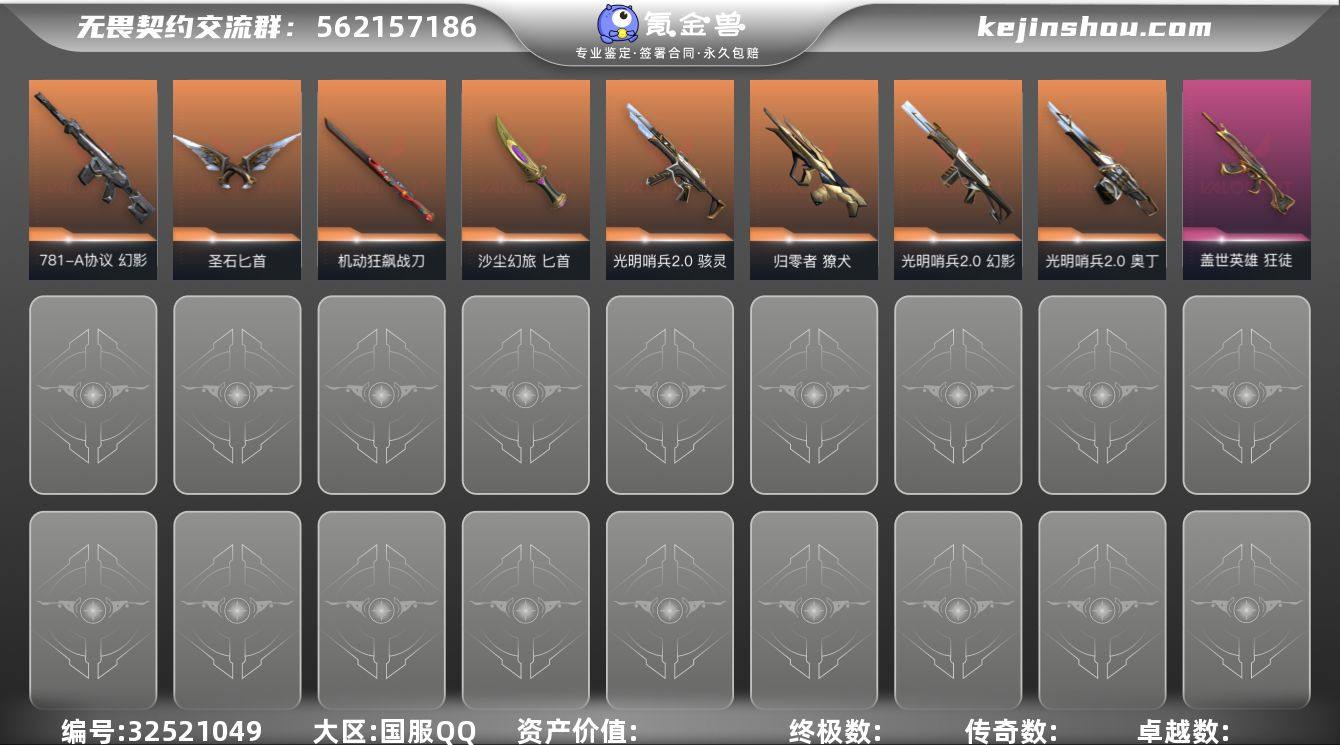 [17783834]9橙皮 1金皮 2紫皮 34皮肤 27英雄 42卡面 265已用源晶 未定级段位 【套装】光明哨兵//2.0套装 【近战武器皮肤】机动狂飙战刀,圣石匕首,匕首-沙尘幻旅 【佩枪皮肤】短炮-光明哨兵2.0 【冲锋枪皮肤】骇灵-光明哨兵2.0 【步枪皮肤】狂徒-塑水宗,狂徒-盖世英雄,幻影-781-A协议,幻影-光明哨兵2.0,幻影-源能者危机001,獠犬-归零者 【机枪皮肤】奥丁-光明哨兵2.0 【挂饰】V25第三幕:黑铁 挂饰,高音谱号挂饰,针织蜜蜂挂饰,冬日絮语挂饰,幸运中国结挂饰,永结同心挂饰