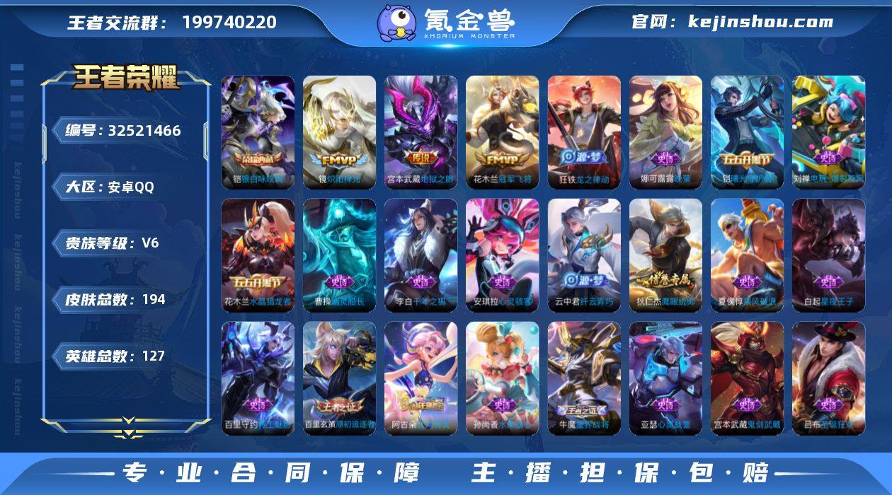 127英雄 194皮肤 可修改实名 男号 【英雄全皮】孙权全皮,蚩奼全皮,大禹全皮 【稀有英雄】大司命,嬴政(始皇帝),韩信(韩跳跳),夏洛特(夏师傅),艾琳,橘右京(橘子),娜可露露(鸟人),不知火舞,赵云,金蝉(唐僧),戈娅 【荣耀水晶】银白咏叹调(倪克斯侍卫) 【传说皮】神树通天,地狱之眼,冠军飞将,炽阳神光 【珍宝阁皮】优雅恋人,蔷薇恋人 【赛季/战令皮】噬灭天穹(s37),古海寻踪(s33),星界游侠,海盐诗旅(s30),擒涛扼浪(s31),探海日志(s32),流音漫舞,地狱燃心,剑破天穹(s35),天穹祈灯(s34),天穹之誓(s36),暖冬·兔眠,大漠名商(s28),云中旅人(s29) 【史诗皮】星界战将,茶境仙,线条小狗-周瑜,巫礼祀神,万灵启世,龙之律动,紫霞仙子,特工魅影,千年之狐,江河有灵,百解令(蒙犽),高渐离燃音魔法,冰冠公主,偶像歌手,晚萤,电玩·爆裂旋风,猫狗日记-孙策,节奏热浪,水果甜心,天才门将,星夜王子,心灵骇客,德古拉伯爵,幽灵船长,鬼剑武藏,心灵战警,地狱岩魂,纤云弄巧,乘风破浪,水晶猎龙者,曙光守护者,金属风暴,原初追逐者,圣诞狂欢,鹰眼统帅,魅力维加斯,赏金猎手,无心,未来纪元-赵云 【限定皮】愿照·九州拓(澜年限),逐霄战戟,鸣野蒿,五谷丰年,李小龙,孙行者 【普通皮】谧流熔炉,敬我三分,雾都夜雨,访茗...
