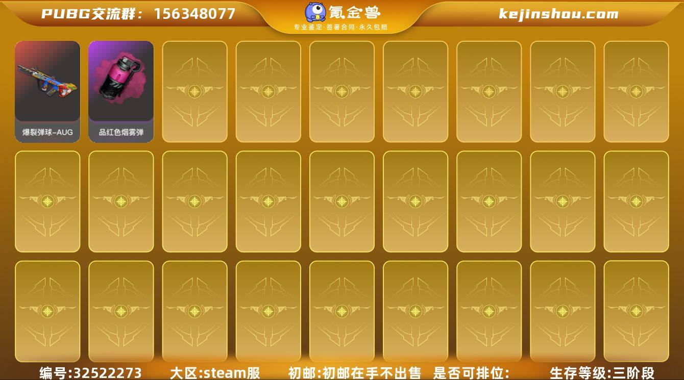 段位:未定级 生存等级:一阶段 5级爆裂弹球-AUG 阿斯顿马丁SUV 卖家说:双跑车 五级aug加一级m4加超多衣服