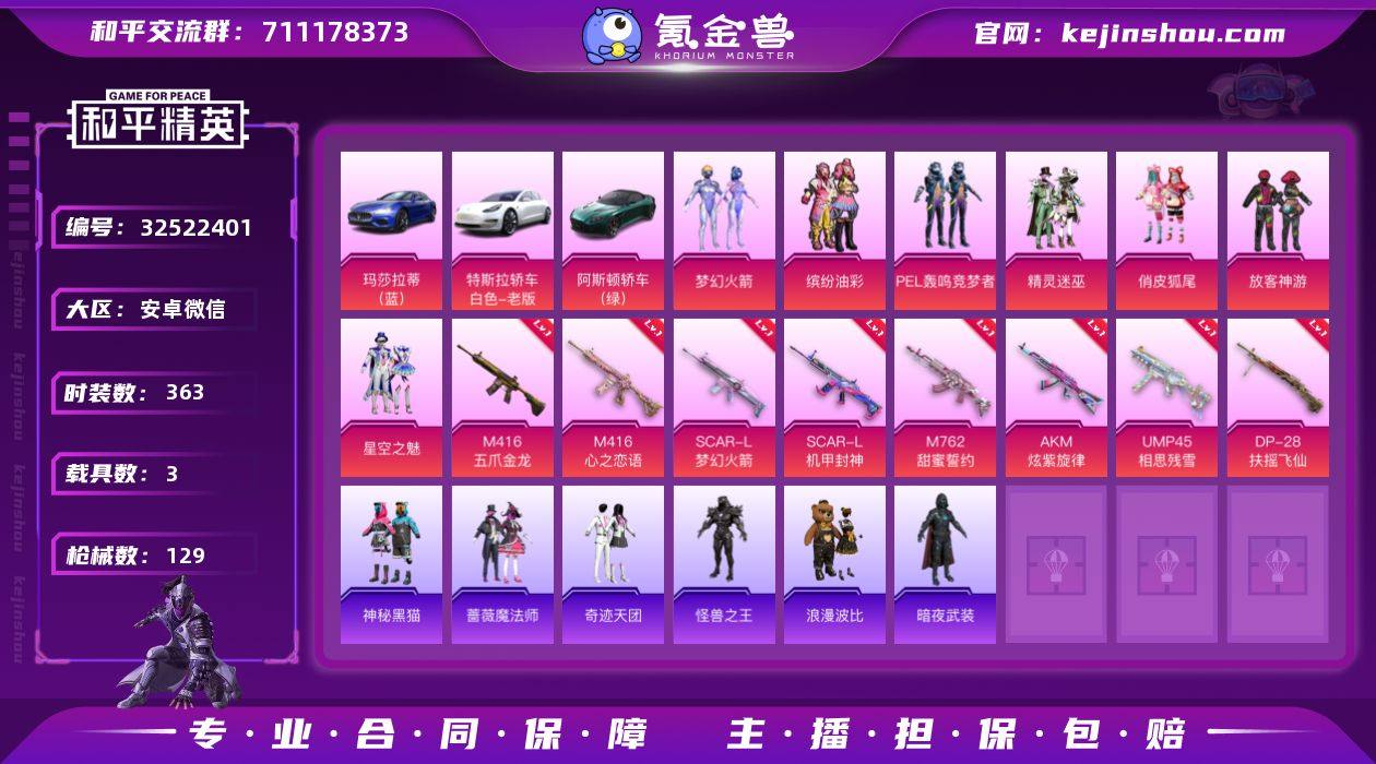 [17785325]7粉装 8特效枪 3载具 5印记 可二次 可修改实名 【热门装扮】梦幻火箭(新101) ,缤纷油彩(猪妹猪脸妹),PEL轰鸣竞梦者,精灵迷巫,俏皮狐尾,放客神游,星空之魅,神秘黑猫,蔷薇魔法师,奇迹天团,怪兽之王,浪漫波比,暗夜武装 【载具】玛莎拉蒂Ghibli(蓝),特斯拉Model 3(珍珠白),阿斯顿·马丁DBS(绿) 【稀有枪皮】M416五爪金龙,M416心之恋语,SCAR-L梦幻火箭,SCAR-L机甲封神,M762甜蜜誓约,AKM炫紫旋律,UMP45相思残雪,DP-28扶摇飞仙 【七级特效枪】七级M416-心之恋语 【五级特效枪】五级M762-甜蜜誓约,五级SCAR-L-梦幻火箭 【四级特效枪】四级DP-28-扶摇飞仙 【一级特效枪】一级M416-五爪金龙,一级SCAR-L-机甲封神,一级UMP45-相思残雪,一级AKM-炫紫旋律 【紫色装扮】游乐,坚韧舞者,圣诞大吉,帅气教官,完美偶像,怒火燎原,SS5特训,北国孤狼,冰川特警,凛冬战士,熔岩使者,牛气满满,特战装甲,甜蜜熊情侣,格斗先锋,SS17特训,疯狂小兔子,蓝色守护者,跃动心情,迎春赐吉,竞技勇士朋克,翡翠奔狼,野性战魂,雪山征服者,雪山精英,霓虹街区,龙腾端午,深海来使,丝绸行者,神秘舞者,SS11特训,原初圣火,逆风勇士,SS12特训,机械征服者,SS9特训,清香五月粽,软嫩糖心蛋,深蓝冒险家,迷域探索者,SS8特训...