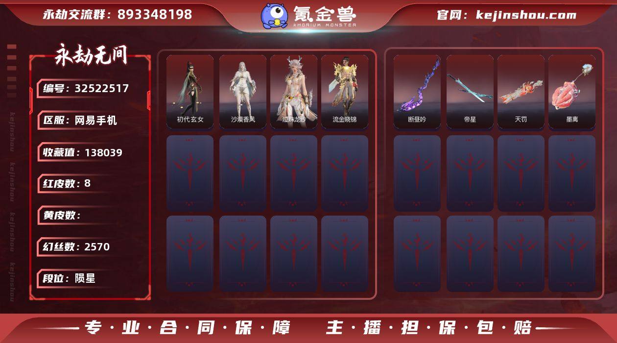 WJ5498,网易手机,可换绑,三人段位陨星4,声望1,8红,173金,等级142,收藏值,幻丝2570,金砖121,通行证Lv50,变身器,封神录赤莲,铠甲勇士帝皇侠,红色神品,墨离,沙漠香风,流金晓锦,初代玄女,泣珠龙纱,天罚,断昼吟,帝星,角色金色皮肤,街头狂欢涂鸦少女,绝伦袍,共赴无间幽夜玲珑,倾国倾城羞花,卷王,黑猫警长班长制服,赤诚心,孤影戎装,盗墓笔记越野帽衫,暖冬茶馨,斩神林七夜,雷行猎手,墨染千秋墨游痕,黑猫警长警长制服,春神句芒,怪诞狂想致命玩笑,怪诞狂想红蓝狂想,紫藤神子,春日序曲晨风,御宅罗梦,昆仑圣女,暗夜利刃,灼舞桃节,妖刀姬,阿娜希塔,煦阳漫叙,2674争斗洪流,若谷,寒烟素,梨园传奇小青,发赤影玄印,赤霄,福禄双至,永乐宝剑,壶中日月,含光承影,醉花风,切影,数珠丸,雷厉,饰品金色皮肤,玄陶俑面女,目瞪马呆女,黑猫警长一只耳,玄陶俑面男,目瞪马呆男,倾国倾城名花,共赴无间绒狐,绷带头套,季中赛2025瀚沙,黑猫警长骑行帽,夜露帽,盗墓笔记防风帽,碎空龙尾,黑猫警长警帽,福虎帽,草莓猫耳,鲛人角,活动中心手机绑定无法解绑,