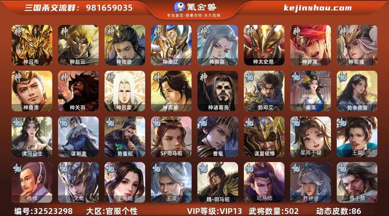 VIP等级: VIP13 官阶: 大将军 武将数量: 502 动态皮肤数量: 86 神将: 神郭嘉,神陆逊,神吕布,神孙策,神太史慈,神荀彧,神张辽,神赵云,神关羽,神吕蒙,神周瑜,神诸葛亮,神鲁肃 魏国武将: 刘晔,戏志才,曹纯,曹婴,陈琳,程昱,郝昭,嵇康,界曹真,界于禁,界钟会,司马师,魏-司马昭,王凌,王元姬,文鸯,杨修,王粲,唐咨-魏,张辽,SP蔡文姬,SP曹仁,SP关羽,SP贾诩,SP姜维,SP庞德,卞夫人,蔡贞姬,曹昂,曹操,曹冲,曹洪,曹丕,曹仁,曹叡,曹嵩,贾逵,王异,张恭,鲁芝,界满宠,曹休,界曹植,满宠,荀攸,王基,钟繇,蒯越蒯良,郭嘉,牵招,荀彧,阮慧,杜畿,界郭嘉,崔琰,界曹丕,界荀彧,朱灵,界甄姬,辛毗,吕虔,界陈群,界王异,界许褚,界郭淮,华歆,陈群,界邓艾,界典韦,界曹休,谋甄姬,司马孚,袁涣,李通,乐进,辛宪英,谋曹仁,郭淮,毛玠,界曹彰,毌丘俭,夏侯惇,曹植,司马朗,谋于禁,界曹操,星周不疑,许褚,界张辽,谋徐晃,张郃,钟会,文聘,曹彰,界夏侯惇,诸葛诞,司马懿,甄姬,杨阜,界徐晃,徐晃,界曹仁,孙资刘放,韩浩史涣,曹真,典韦,界夏侯渊,谋荀彧,夏侯渊,李典,于禁,王双,邓艾,界司马懿,张春华,孟达-魏,臧霸,朱灵(国战),文钦-魏,谋夏侯惇,曹髦,成济,玄·毌丘俭,李昭焦伯,清河公主,SP司马昭,司马伷,谋郭嘉,势董昭,谋张辽,王经,谋郭...