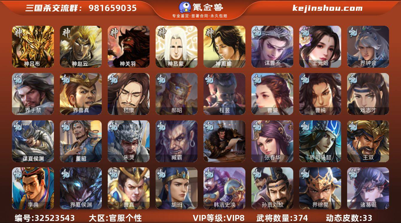 VIP等级: VIP8 官阶: 大将军 武将数量: 374 动态皮肤数量: 33 神将: 神吕布,神赵云,神关羽,神吕蒙,神周瑜 魏国武将: 戏志才,曹纯,曹婴,程昱,郝昭,嵇康,界曹真,界于禁,界钟会,王元姬,唐咨-魏,张辽,SP蔡文姬,SP曹仁,SP关羽,SP贾诩,SP姜维,SP庞德,卞夫人,蔡贞姬,曹昂,曹操,曹冲,曹洪,曹丕,曹仁,曹叡,贾逵,王异,张恭,鲁芝,界满宠,曹休,界曹植,满宠,荀攸,王基,钟繇,郭嘉,荀彧,阮慧,界郭嘉,崔琰,界曹丕,界荀彧,朱灵,界甄姬,吕虔,界陈群,界王异,界许褚,华歆,陈群,界邓艾,界典韦,界曹休,袁涣,李通,乐进,辛宪英,郭淮,界曹彰,郭皇后,毌丘俭,夏侯惇,曹植,司马朗,谋于禁,界曹操,许褚,界张辽,谋徐晃,张郃,钟会,文聘,曹彰,界夏侯惇,诸葛诞,司马懿,甄姬,界徐晃,徐晃,孙资刘放,韩浩史涣,胡班,曹真,谋曹丕,典韦,界夏侯渊,夏侯渊,李典,于禁,王双,邓艾,界司马懿,张春华,孟达-魏,臧霸,朱灵(国战),董昭,谋夏侯渊 蜀国武将: 花鬘,沙摩柯,谋马超,谋赵云,马云騄,徐庶,界魏延,杨仪,界关羽,界诸葛亮,界伊籍,胡金定,费祎,严颜,界黄月英,界张嶷,赵云,张松,彭羕,李丰,界刘备,界刘禅,谋姜维,刘封,糜竺,谋庞统,黄月英,关羽,吴懿,界吴懿,界廖化,向宠,祝融,张飞,黄皓,陈震,魏延,界周仓,马忠,界法正,糜夫人,界孟...