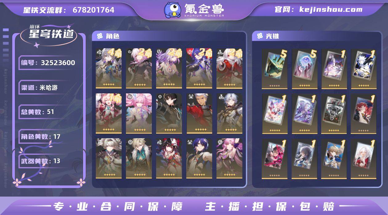 【崩坏·星穹铁道】冒险等级:70,女主,五星数量:30,五星角色:布洛妮娅 * 4命,克拉拉 * 2命,遐蝶 * 2命,黄泉 * 2命,长夜月 * 2命,风堇 * 1命,瓦尔特,罗刹,符玄,真理医生,花火,砂金,白厄,Archer,丹恒·腾荒,昔涟,流萤__五星光锥:星海巡航 * 5精,记忆永不落幕 * 5精,制胜的瞬间,银河铁道之夜,以世界之名,无可取代的东西,如泥酣眠,但战斗还未结束,让告别,更美一些,行于流逝的岸,愿虹光永驻天空,黎明恰如此燃烧,致长夜的星光__四星角色:黑塔 * 6命,丹恒 * 6命,艾丝妲 * 6命,希露瓦 * 6命,佩拉 * 6命,玲可 * 6命,雪衣 * 6命,米沙 * 6命,加拉赫 * 6命,青雀 * 5命,阿兰 * 4命,娜塔莎 * 4命,三月七 * 4命,驭空 * 4命,卢卡 * 4命,寒鸦 * 4命,虎克 * 3命,停云 * 3命,桑博 * 3命,桂乃芬 * 3命,貊泽 * 2命,素裳