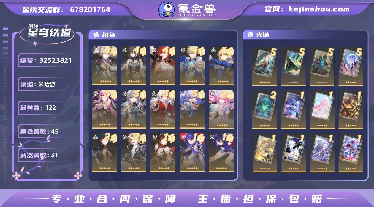 顶级面板65流萤,主推角色基本齐全,配队齐全,5星基本都是大毕业有2000弓皮可刀