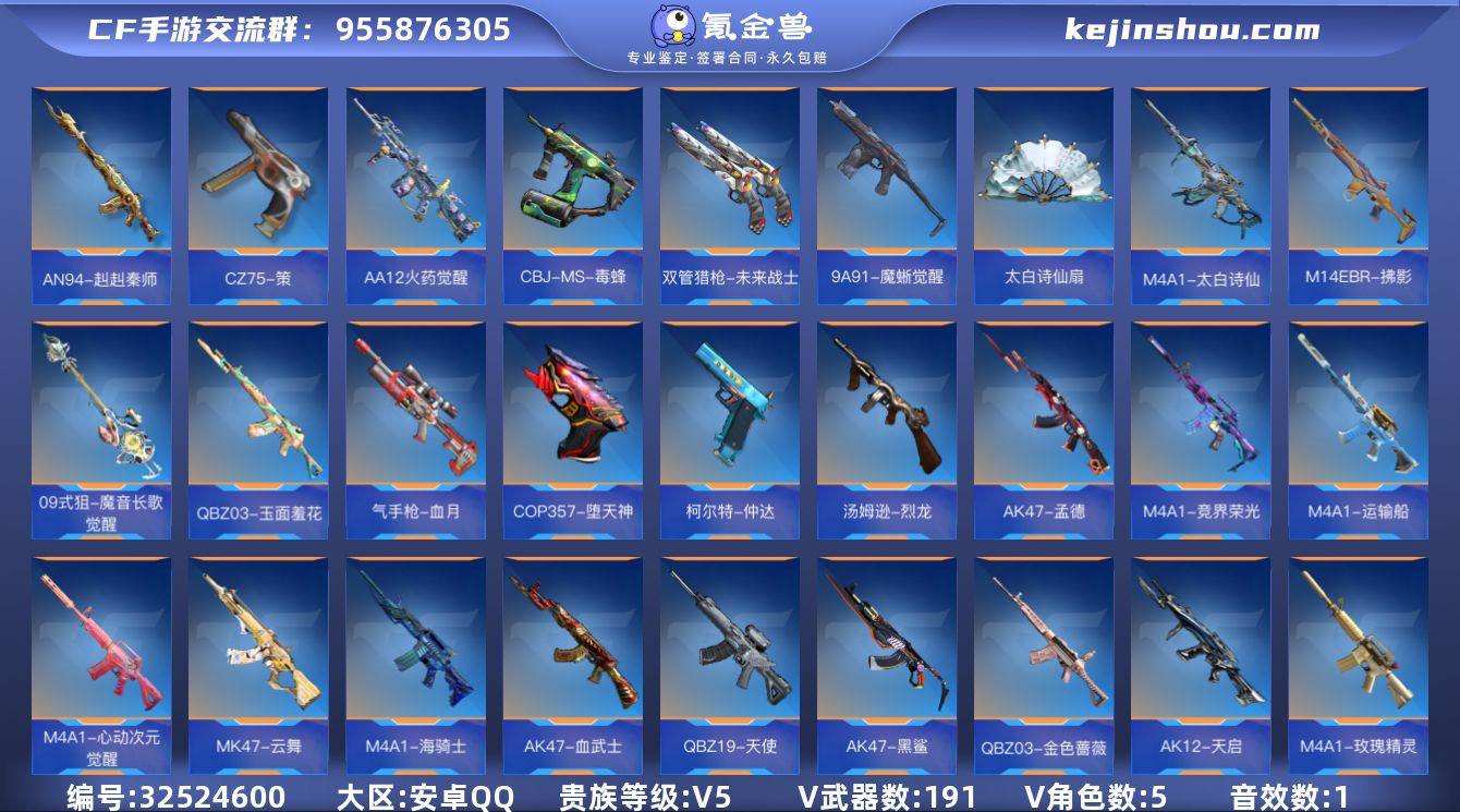 VIP5/191V/孟德套/王者之神/王者之蝶/王者之尊/COP357-安琪拉/AK47-孟德/81式-阿波罗/COP357-堕天神/王者之神-冰霜奇迹/巴雷特-毁灭-现代战场/审判者/葵/瞳/炽天使-X/零-新生/AK47-火麒麟/AK47-血武士/AK47-黑鲨/AK47-木兰/AK47-谜城烟火/M4A1-雷神/M4A1-黑龙/M4A1-死神/M4A1-玫瑰精灵/M4A1-竞界荣光/M4A1-海骑士/M4A1-堕天神/M4A1-心动次元觉醒/M4A1-运输船/M4A1-太白诗仙/SCAR-心动PICK/AN94-赳赳秦师/FAMAS-湮灭/9A91-天神/9A91-魔蜥觉醒/M14EBR-拂影/M14EBR-葫芦山庄/AK12-天启/QBZ03-金色蔷薇/QBZ03-玉面羞花/QBZ19-天使/G36-李星云/MK47-云舞/G3A3-衍神兵/FN F2000-十绝阵觉醒/QBZ191-封神榜/AWM-天龙/AWM-天使/AWM-指南针觉醒/巴雷特-毁灭/巴雷特-极光/09式狙-天神/09式狙-魔音长歌觉醒/98K-黑骑士/加特林-堡垒/加特林-蟒蛇/QBB95-极光/汤姆逊-烈龙/双持斯泰尔-天使/CBJ-MS-毒蜂/打击者-天神/地狱火/嗜血金鲨/地狱烈炎/AA12火药觉醒/KSG-天使/KSG-钟馗觉醒/USP-神罚/USP-机械迷城/USP-太白诗仙/沙鹰-修罗/沙鹰-孟德/气手枪-血月/沙鹰-宇航兔兔/双持GLOCK18-本初/改装GLOCK-樱龙·超觉/QSZ92-华夏传说/双管猎枪-未来战士/柯尔特-仲达/双持柯尔特-极光/CZ75-策/掠夺者P36...