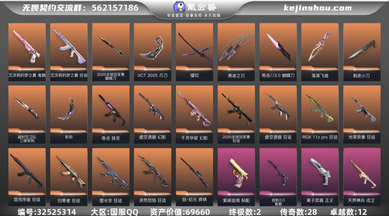 【自带包赔 可赔三倍】:库存价值69660 限定25冠军套 VCT爪刀 124款皮肤 多热门主战刀皮 性价比超值 【限定】: 2025全球冠军赛 狂徒, 2025全球冠军赛 蝴蝶刀, VCT 2025 爪刀 【近战】: 剥皮小刀, 超时空卫队 三棱军刺, 黑波之刃, 2025全球冠军赛 蝴蝶刀, 影钩, 奇点//2.0 蝴蝶刀, 落英飞旋, VCT 2025 爪刀, 镭切 【狂徒】: RGX 11z Pro 狂徒, 掠影 狂徒, 2025全球冠军赛 狂徒, 归零者 狂徒, 光荣异象 狂徒, 离子武器//2.0 狂徒, 塑水宗 狂徒, 盖亚的复仇 狂徒, 虚空遗器 狂徒, 混沌序曲 狂徒, 洪荒怒焰 狂徒, 艾沃莉的梦之翼 狂徒, 日冕雄师 狂徒 【幻影】: 异鳞魔蛇 幻影, 侦察力量 幻影, 虚空遗器 幻影, 千灵华绽 幻影 【冥驹】: 堕天遗武 冥驹 【正义】: 离子武器 正义 【戍卫】: 掠影 戍卫, 天界神兵 戍卫 【鬼魅】: 掠影//2.0 鬼魅, 艾沃莉的梦之翼 鬼魅 【骇灵】: 奇点 骇灵 【标配】: 紫阙金琅 标配 【莽侠】: 创·纪元 莽侠 【概要】: 总皮肤 124 终极 2 传奇 28 卓越 12 刀皮 英雄 28 LV 176 历史最高:钻石 当前段位:未定级 已使用 1405 R点 剩余 40 R点 可二次 卡面、挂饰、其他皮肤请看截图 道具、段位等以实际验号为准。如账号因没有维护,赛季更新...