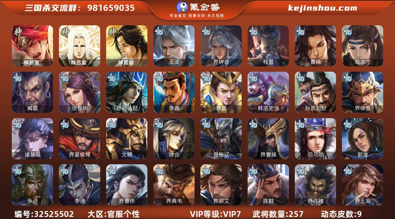 12史诗 3神 神孙策 神吕蒙 神周瑜 界钟会 谋马超 戏志才等一堆厉害武将 会员7 257武将 200皮肤 4万雁翎可合皮肤 三卡充足 三国杀官服移动版活绑 账号内容丰富,皮肤多,雁翎充足,三卡够用 需要直接拍 A4