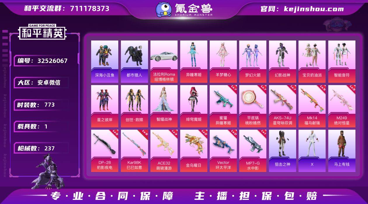 实名: 不可修改 时装数: 773 载具数: 1 枪械数: 237 战备数: 169 热门装扮: 梦幻火箭(新101),幻影战神,深海小丑鱼,宝贝奶油派,迅捷狂鲨,鹰眼刺客,智能音符,都市猎人,东方飞龙,星之彼岸,创世·救赎,智耀战神,绯穹魔姬,羊梦糖心,异瞳寒姬 载具: 法拉利Roma(纽博格林银) 稀有枪皮: Vector环太平洋,Kar98K-巳巳如意,平底锅-桃粉嫣然,AKS-74U-星穹咏叹调,DP-28-豹影疾电,蜜獾-异瞳寒姬,M249-绝对恒星,ACE32-萌骑漫游,MP7-G-水中影,信号枪-金乌曜日