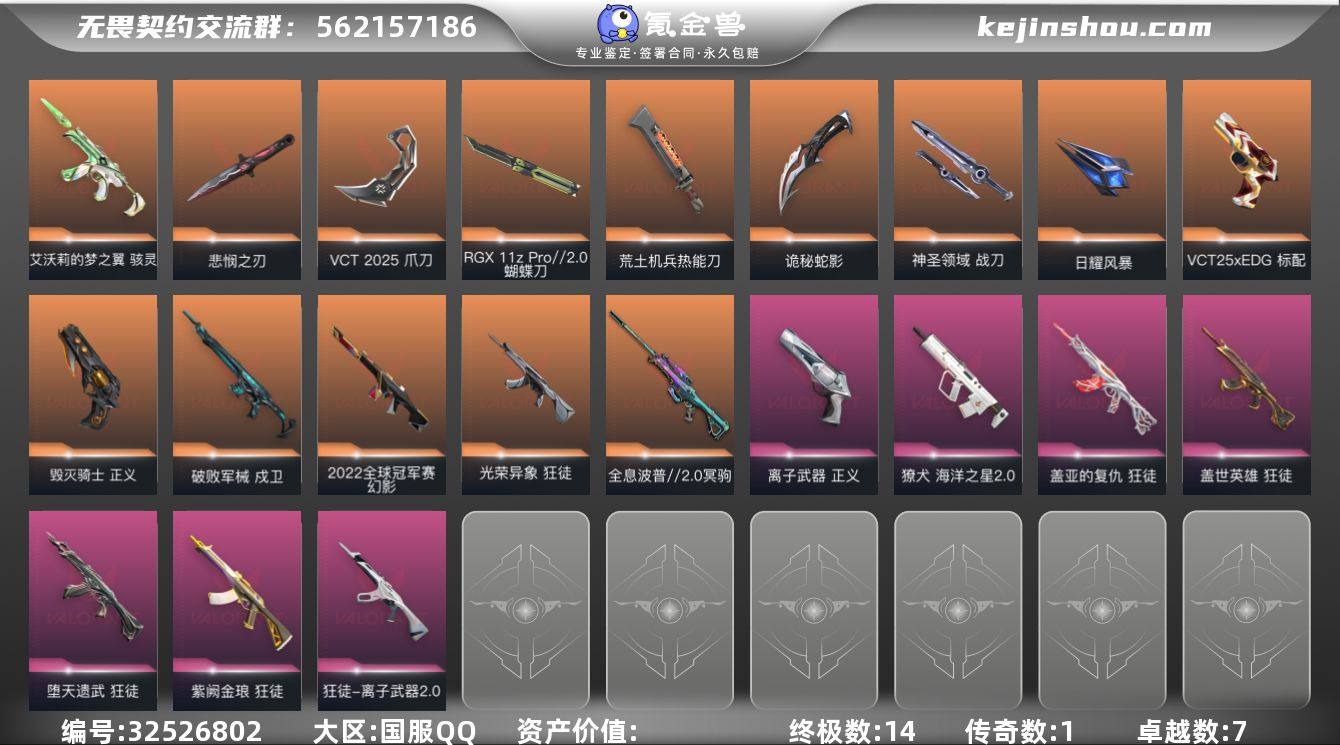 【套装】:无畏契约季前邀请赛套装,VCT 2025 赛季套装 【英雄】:幻棱,炼狱,维斯,暮蝶,钛狐,壹决,铁臂,捷风,雷兹,幽影,不死鸟,贤者,猎枭,蝰蛇,零,芮娜,奇乐,尚勃勒,霓虹,斯凯,夜露,星礈,K/O,海神,盖可,黑梦,钢锁 【近战武器】:近战武器-无畏契约季前邀请赛 悲悯之刃,近战武器-RGX 11z Pro//2.0 蝴蝶刀,近战武器-VCT 2025 爪刀,近战武器-荒土机兵 热能刀,近战武器-生物分子解离器,近战武器-诡秘蛇影 军刀,近战武器-神圣领域 战刀,近战武器-日耀风暴 遗器 【狂徒】:狂徒-光荣异象,狂徒-堕天遗武,狂徒-盖世英雄,狂徒-盖亚的复仇,狂徒-紫阙金琅,狂徒-离子武器//2.0,狂徒-荒土机兵,狂徒-诡秘蛇影 【幻影】:幻影-2022全球冠军赛,幻影-神圣领域,幻影-纳米打击,幻影-末日之翼 【戍卫】:戍卫-破败军械,戍卫-逆冲蛮牛,戍卫-月球哨兵,戍卫-折光棱晶 【獠犬】:獠犬-海洋之星//2.0,獠犬-神圣领域,獠犬-逆冲蛮牛 【冥驹】:冥驹-全息波普//2.0,冥驹-荒土机兵,冥驹-星云暗涌 【飞将】:飞将-末日之翼 【莽侠】:莽侠-诡秘蛇影,莽侠-月球哨兵 【战神】:战神-神圣领域 【奥丁】:奥丁-纳米打击,奥丁-末日之翼 【判官】:判官-诡秘...