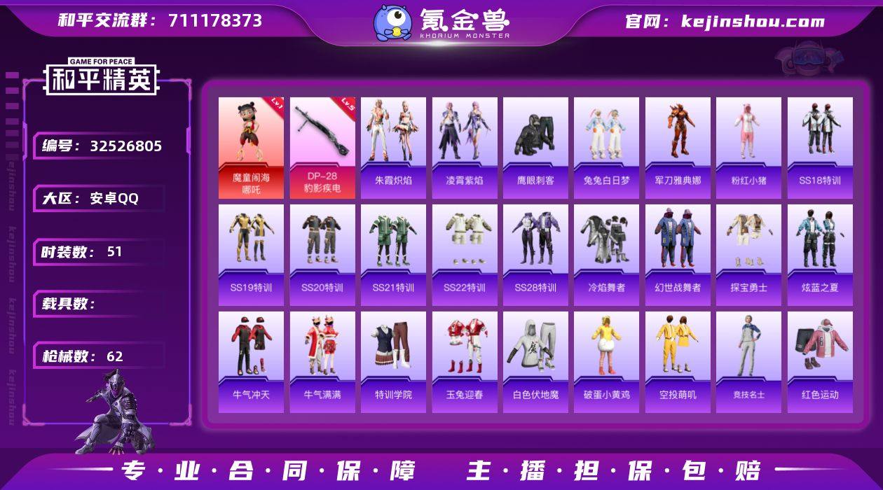 安卓【红装号 魔童闹海-哪吒(一级)/角色-军刀雅典娜/套装-粉红小猪】 手Q-1神装-0粉装-1特效枪-0载具-0粉色飞行器-19250热力值-5王牌印记-51套装-62枪皮 【红色神装等级】:魔童闹海-哪吒(一级) 【红色角色神装】:魔童闹海-哪吒 【热门品类】:角色-军刀雅典娜,套装-粉红小猪 【粉色枪皮等级】:DP-28-豹影疾电(五级) 【粉色枪皮】:DP-28-豹影疾电 【粉色降落伞】:荧海星豚降落伞 【稀有套装】:套装-朱霞炽焰,套装-凌霄紫焰 【稀有枪皮】:AKM-破晓战魂,M16A4-幻世战舞者,SCAR-L-炫彩节奏,SCAR-L-玉兔迎春,SCAR-L-红色方程式,M416-红色方程式,M416-蓝色火焰,GROZA-田园牧歌,AUG-天降萌叽,AUG-海螺星光,QBZ-彩虹符号,M762-天降萌叽,AC-VAL-天降萌叽,ARX-凌霄紫焰,UZI-啾咪啾咪,UZI-天降萌叽,UMP45-蓝色火焰,UMP45-绒宝小鹅,Vector-彩虹符号,Vector-生命誓言,Vector-田园牧歌,汤姆逊-耀粉歌者,汤姆逊-像素花束,JS9-凌霄紫焰,Kar98K-红色方程式,VSS-田园牧歌,Mini14-耀粉歌者,S686-红色方程式,S1897-炫彩节奏,S12K-幻世战舞者,SPAS-12-田园牧歌,M249-绯穹魔姬,DP-28-彩虹符号,MG3-幻世战舞者,MG-36-凌霄紫焰,P92-凌霄紫焰,沙漠之鹰-旋...