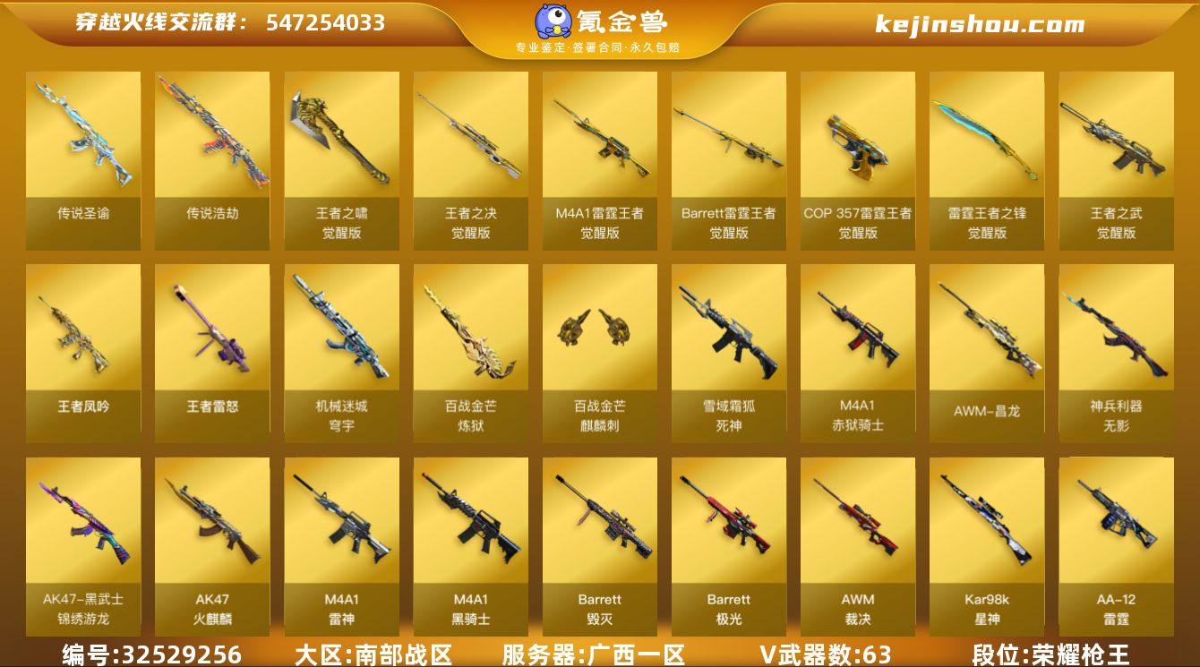 【ky6400】广西一区-83V-28王者武器数-0炫金武器数 【传说武器】:传说圣谕,传说浩劫 【热门武器】:传说浩劫,传说圣谕,G36C-幻影,QBZ03-金色蔷薇,Scar Light-白虎,M200-竞技荣光,柯尔特-冠军之特,Kar98K-星神,M4A1-黑骑士,汤姆逊-烈龙*5,MK5-炽火炎龙,USP-雷暴,炽芒蝶刃*2 【王者炫金武器】:王者凤吟,王者雷怒,王者冰锋*2,高爆手雷-雷霆王者*2 【音效卡】:AK47-火麒麟音效卡,Barrett-毁灭音效卡,AWM-裁决音效卡,Scar Light-白虎音效卡,G36C-幻影音效卡,炼狱-百战金芒-庆典舞曲音效卡,死神-雪域霜狐-怀旧音效卡 【皮肤】:幻神-冠军之幻,白虎-霓虹机甲 皮肤,白虎-巅峰荣耀 皮肤,白虎-梅雀衔霜 皮肤,QBZ03-CFS2024 皮肤,裁决-流光秘银,AWM-裁决-凤灵皮肤,裁决-胜者为王 皮肤,裁决-星际旅行 皮肤,星神-黯钢战甲 皮肤,雷神-荣耀之魄,雷神-星空,雷神-宇航兔皮肤,雷神-高能霹雳 皮肤,雷神-源计划2.0专属 皮肤,M4A1-再燃火线,雷神-神秘按键 皮肤,火麒麟-平天大圣,火麒麟-心动糖果,毁灭-风暴,毁灭-魔灵皮肤,毁灭-虹光风暴 皮肤,毁灭-英雄计划 皮肤,M4A1-千变-孔明皮肤,黑骑士-破界 皮肤,AWM-再燃火线,极光-高能霹雳 皮肤,屠龙-荣...
