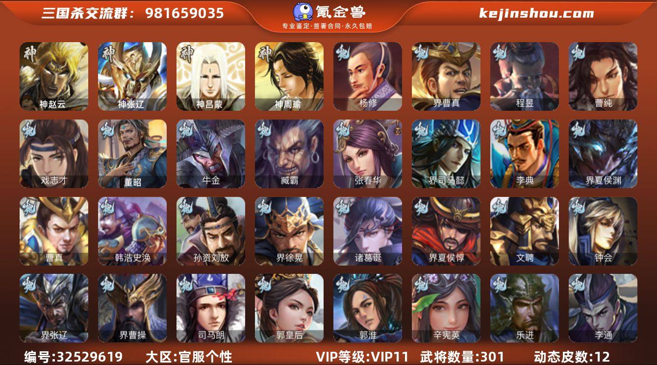 神赵云,神张辽,杨修,界曹真,曹纯,戏志才,程昱,谋黄忠,周群,赵襄,谯周,花鬘,鲍三娘,留赞,界徐盛,左慈,张让,麹义,沮授,兀突骨,神吕蒙,神周瑜,SP关羽,SP蔡文姬,乐进,曹昂,诸葛诞,朱灵,文聘,SP姜维,张春华,钟会,曹冲,郭淮,满宠,界王异,界曹操,界司马懿,界夏侯惇,界张辽,界许褚,界郭嘉,李典,曹真,韩浩史涣,陈群,曹叡,曹休,钟繇,司马朗,李通,郭皇后,孙资刘放,辛宪英,界甄姬,吕虔,鲁芝,界徐晃,杜畿,界曹丕,界邓艾,界曹植,卞夫人,华歆,谋徐晃,谋于禁,牛金,界夏侯渊,臧霸,唐咨,董昭,SP孙尚香,关银屏,夏侯霸,马良,关兴张苞,廖化,界马岱,关平,简雍,刘封,界法正,界关兴张苞,界刘备,界关羽,界赵云,界马超,SP徐庶,吴懿,周仓,张松,刘谌,夏侯氏,糜竺,马忠,李严,黄皓,吴苋,秦宓,界黄月英,赵统赵广,严颜,界伊籍,界卧龙诸葛,界庞统,界孟获,界祝融,界姜维,吕凯,邓芝,糜夫人,界周仓,蒋琬,谋张飞,吴班,诸葛果,蒋琬费祎,甘夫人,鲁肃,孙茹,凌操,大乔小乔,诸葛恪,诸葛瑾,孙鲁育,程普,韩当,潘璋马忠,虞翻,朱然,界...