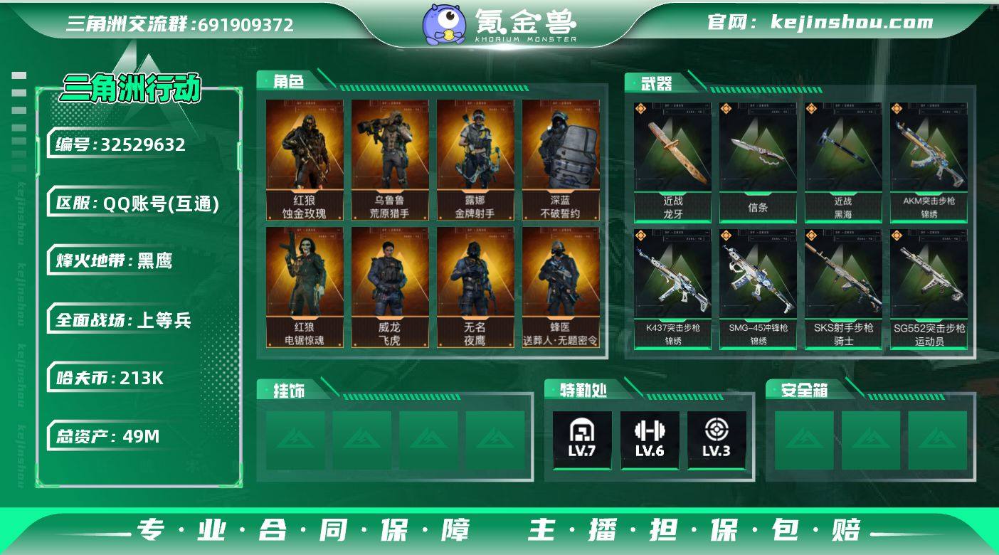 【BL店家主推精氪号·49m60级满级9干员皮蚀金玫瑰·飞虎·4刀皮·2x3保险7级仓库3级负重6级体力】 49m总资产-213k哈夫币-60烽火等级-黑鹰-40战场等级-上等兵 【干员外观】:红狼-蚀金玫瑰,威龙-飞虎,蜂医-送葬人·无题密令,无名-夜鹰,深蓝-不破誓约,红狼-电锯惊魂,露娜-金牌射手,乌鲁鲁-荒原猎手,蛊-不羁人生 【近战皮肤】:近战-信条,近战-黑海,近战-龙牙,近战-处刑者3级,近战-黑鹰 【传说外观】:M4A1突击步枪-蚀金玫瑰,M4A1突击步枪-阿米娅,AKM突击步枪-锦绣,ASh-12战斗步枪-鹅鸭杀,M16A4突击步枪-狩猎时刻,AUG突击步枪-悠然茶歇,SG552突击步枪-运动员,AK-12突击步枪-夜鹰,AK-12突击步枪-特斯拉线圈,SCAR-H战斗步枪-水墨云图,SCAR-H战斗步枪-启航,G3战斗步枪-狩猎时刻,CAR-15突击步枪-阿米娅,K437突击步枪-锦绣,KC17突击步枪-电锯惊魂,MK47突击步枪-悠然茶歇,MP5冲锋枪-黑海,Vector冲锋枪-狩猎时刻,UZI冲锋枪-特斯拉线圈,UZI冲锋枪-悠然茶歇,SMG-45冲锋枪-骑士,SMG-45冲锋枪-锦绣,SR-3M紧凑突击步枪-特斯拉线圈,勇士冲锋枪-能天使-午夜邮差,QCQ171冲锋枪-鹅鸭杀,QCQ171冲锋枪-不羁人生,725双管霰弹枪-送葬人-无题密令,PKM通用机枪-荼蘼...