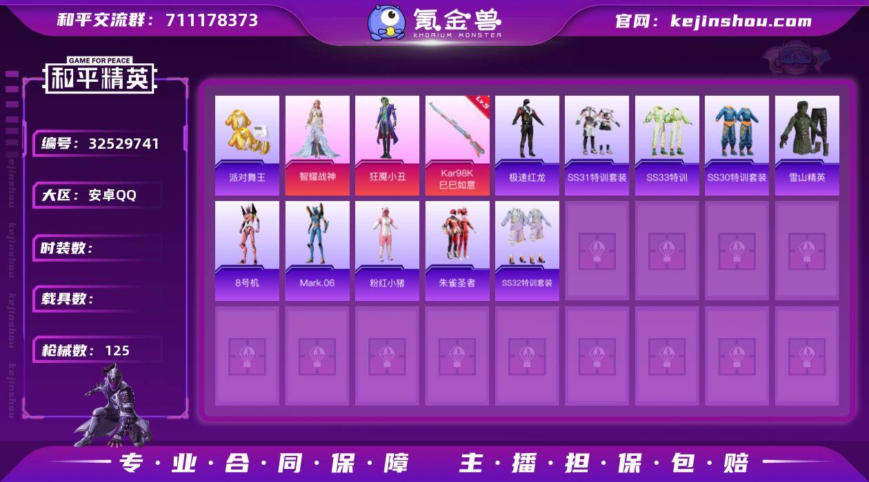 安卓Q 可二次 2粉装1特效枪96套装 125枪皮 派对舞王 派对舞王(金靴子) 狂魇小丑 智耀战神 Kar98K-巳巳如意 (5级) 齐天大圣飞行器 8号机 Mark.06 雪山精英 粉红小猪 朱雀圣者 极速红龙 甜心宝贝背包 和平精英账号