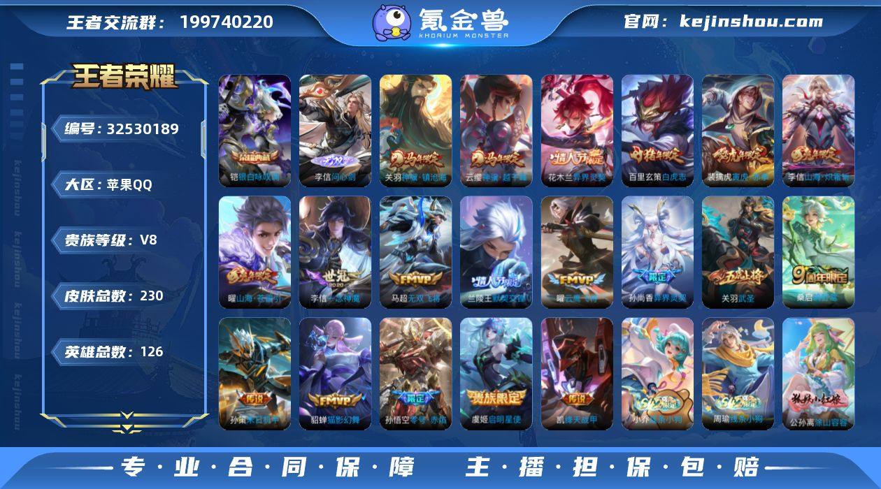 CHC11131 苹果Q-V8-最强王者段位-126英雄-230皮肤-1典藏皮肤-1无双-19传说-76史诗 【英雄全皮】:李信全皮 【荣耀典藏】:铠银白咏叹调 【无双皮肤】:李信问心剑 【传说皮肤】:云缨神骥越千峰,关羽神骥镇沧海,花木兰异界灵契,桑启鸣野蒿,曜山海苍雷引,李信山海炽霜斩,马超无双飞将,孙策末日机甲,裴擒虎寅虎赤拳,孙尚香异界灵契,兰陵王默契交锋,铠绛天战甲,虞姬启明星使,孙悟空零号赤焰,关羽武圣,曜云鹰飞将,李信一念神魔,貂蝉猫影幻舞,百里玄策白虎志 【限定皮肤】:狄仁杰阴阳师,廉颇寅虎御盾,赵云皇家上将,墨子神迹守卫,妲己时之彼端,嬴政优雅恋人,孙尚香异界灵契,庄周高山流水,高渐离玩趣恶龙,钟无艳超时空战士,吕布御风骁将,周瑜真爱至上,甄姬落雪兰心,马可波罗逐梦之星,马可波罗山海玄木吟,狄仁杰魔术师,狄仁杰万华元夜,达摩星际陆战队,达摩沙漠行僧,项羽海滩派对,老夫子醍醐杖,老夫子航海奇遇记,关羽武圣,程咬金演武夺筹,韩信逐梦之影,王昭君午后时光,兰陵王默契交锋,兰陵王金庭之子,孙悟空零号赤焰,孙悟空孙行者,牛魔御旌,后羿圣弓游侠,李元芳云中旅人,虞姬启明星使,钟馗驱傩正仪,干将莫邪真爱魔法,雅典娜单...