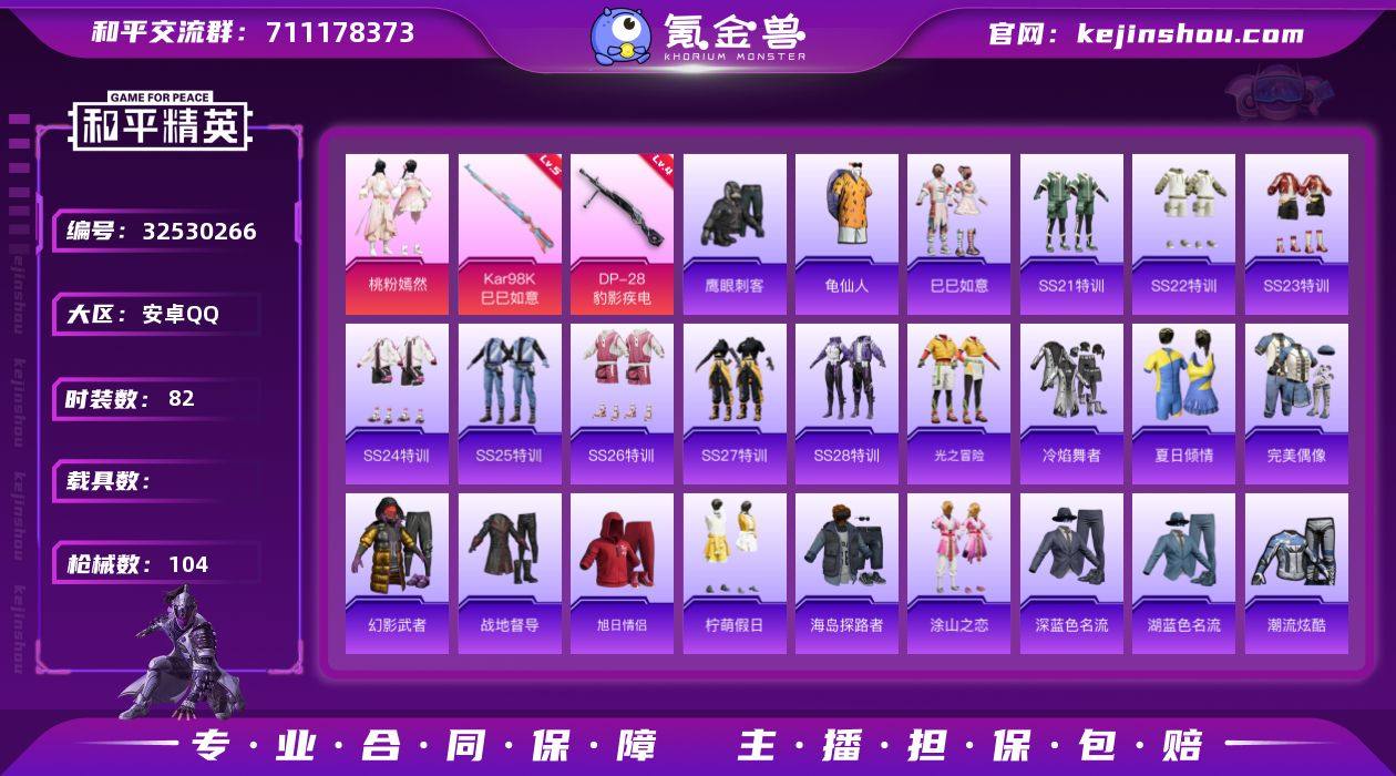 LK263205安卓 手Q-1粉装-2特效枪-0载具-1粉色飞行器-26521热力值-11王牌印记-82套装-104枪皮 【热门品类】:套装-龟仙人 【粉色套装】:粉装-桃粉嫣然 【粉色枪皮等级】:Kar98K-巳巳如意(五级),DP-28-豹影疾电(四级) 【粉色枪皮】:Kar98K-巳巳如意,DP-28-豹影疾电 【粉色飞行器】:炫彩糖果飞行器 【稀有套装】:套装-龟仙人,套装-巳巳如意 【稀有枪皮】:AKM-彩虹符号,AKM-影袭,AKM-破晓战魂,AKM-龙的传人,SCAR-L-夜灯,SCAR-L-玉兔迎春,SCAR-L-黄金龙骨,M416-糯团青竹,M416-绯红前夜,M416-蓝色火焰,GROZA-懵萌河马,GROZA-田园牧歌,AUG-耀粉歌者,QBZ-彩虹符号,M762-天降萌叽,M762-绯红前夜,Mk47-妙红点点,G36C-懵萌河马,AC-VAL-天降萌叽,蜜獾-天降萌叽,蜜獾-娇憨猪猪,UZI-天降萌叽,UZI-娇憨猪猪,UZI-影袭,UMP45-夜灯,UMP45-涂山之恋,UMP45-炫光之旅,UMP45-生命誓言,Vector-田园牧歌,汤姆逊-天降萌叽,汤姆逊-耀粉歌者,P90-巳巳如意,M24-影袭,M24-仲夏莫吉托,SKS-糯团青竹,VSS-彩虹符号,VSS-田园牧歌,Mini14-涂山之恋,Mini14-耀粉歌者,SLR-娇憨猪猪,莫辛纳甘-懵萌河马,AMR-妙红点点,AMR-白勺歌姬,M417-惊鸿侠骨,M200-惊鸿侠骨...