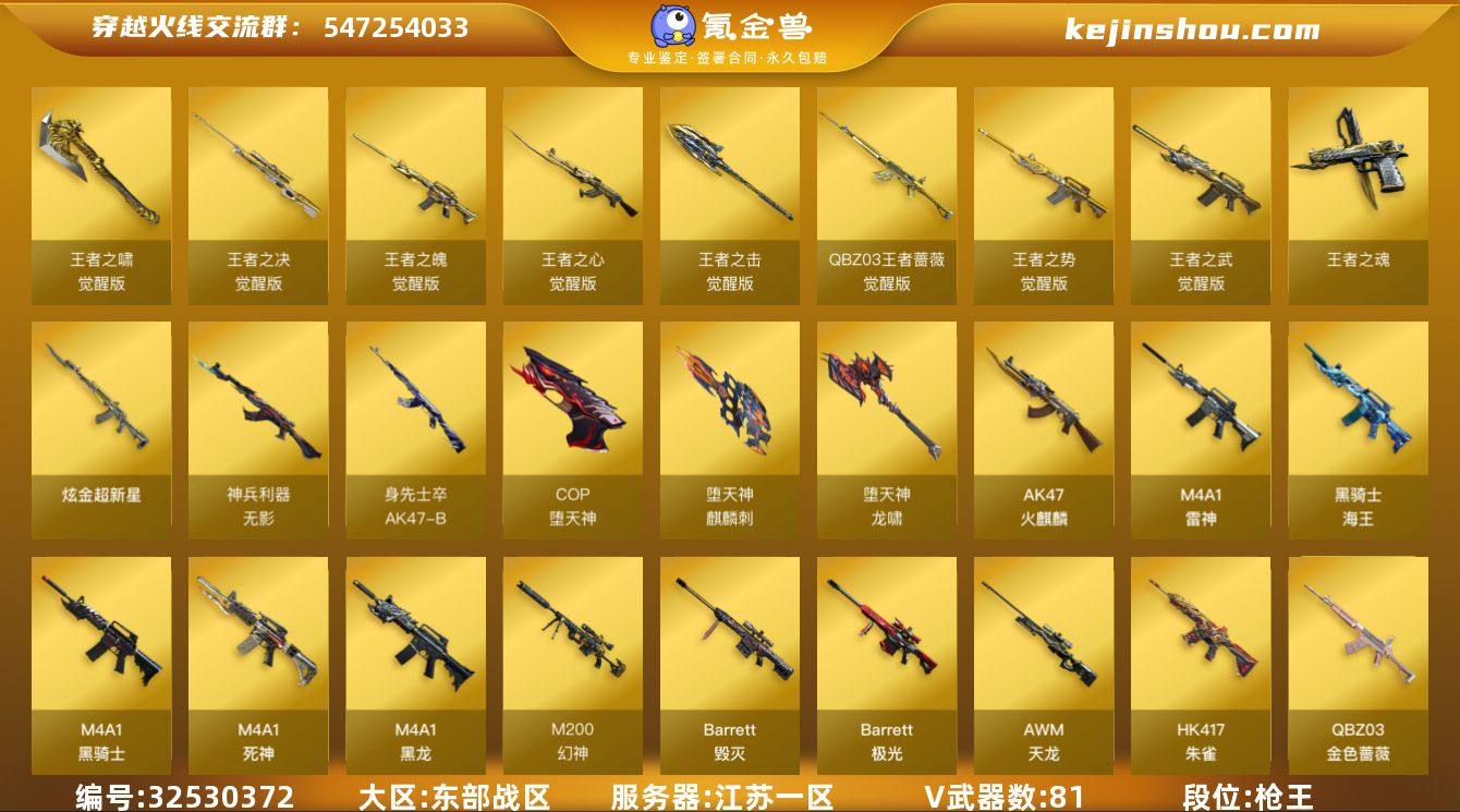 【自带包赔 最高三倍】:东部战区:江苏一区-LV102-等级元首-段位枪王-81V-14王者-2炫金 【传说武器】:传说光耀 【热门武器】:传说光耀,QBZ03-金色蔷薇,Scar Light-白虎,HK417-朱雀,M200-幻神,死亡之眼,荣耀世冠-柯尔特,M4A1-黑骑士,加特林-炼狱*3,COP-堕天神,沙鹰-修罗*5 【王者炫金武器】:王者之魂,王者之魄高爆手雷,王者之魄闪光弹,闪光弹-雷霆王者,炫金骑士,炫金超新星 【音效卡】:M4A1-黑骑士音效卡,Barrett-毁灭音效卡 【皮肤】:雷神-荣耀之魄,AK47-火麒麟-传奇EVEN,火麒麟-战神关羽,传奇石头-横秒之巅,火麒麟-心动糖果,毁灭耀金皮肤,毁灭-黑大圣皮肤,黑龙-能量核心,黑龙-暗月,M4A1-黑龙-361,黑龙-墨子皮肤,黑骑士-暗月,黑骑士耀金皮肤,无影-能量核心,战神-粉色甜心皮肤,战神-紫绶金章皮肤,战神-流金岁月皮肤,AK47-B-常胜将军-曹操,AK47-B-常胜将军-孙权,AWM-天龙-传奇70KG,AWM-天龙-传奇白鲨,极光-能量核心,修罗-能量核心 【角色】:零,瞳,魅影,迷迭香,王者-瞳-闭月羞花,北极狐-X,初恋灵狐,芳心审判者,风暴女,嘉年华灵狐,娟娟,灵狐者-X,灵狐者-黄金海岸,麻雀,曼陀罗-X,曼陀罗-礼服,潘多拉-X,潘多拉...