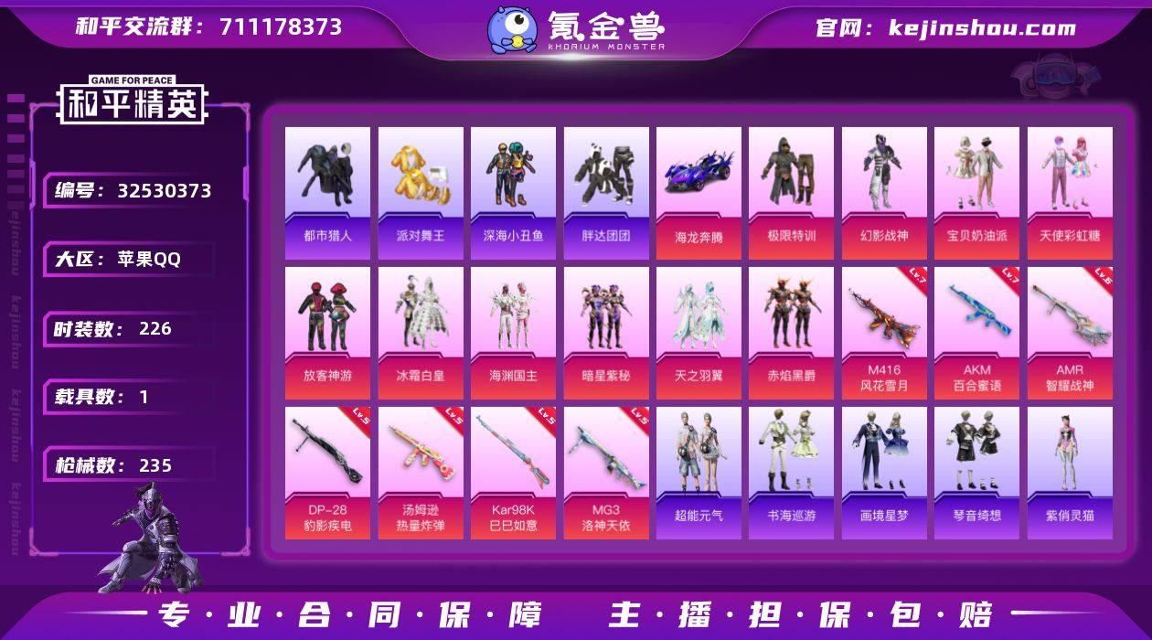 苹果 手Q-10粉装-9特效枪-1载具-2粉色飞行器-84751热力值-18王牌印记-226套装-235枪皮 【热门品类】:套装-浪漫天命,套装-都市猎人,套装-派对舞王,套装-深海小丑鱼,套装-小丑鱼,套装-胖达团团,套装-金羽特工,套装-星河浪客,套装-龟仙人,套装-潮萌小黄鸭,套装-暗影哥特 【粉色套装】:粉装-极限特训,粉装-幻影战神,粉装-宝贝奶油派,粉装-天使彩虹糖,粉装-放客神游,粉装-冰霜白皇,粉装-海渊国主,粉装-暗星紫秘,粉装-天之羽翼,粉装-赤焰黑爵 【粉色枪皮等级】:AKM-百合蜜语(七级),M416-风花雪月(七级),汤姆逊-热量炸弹(五级),AKS-74U-森灵之息(五级),Kar98K-巳巳如意(五级),Mk14-福马献瑞(四级),AMR-智耀战神(六级),DP-28-豹影疾电(五级),MG3-洛神天依(五级) 【粉色载具】:海龙奔腾,僚机-萌兔起飞 【粉色枪皮】:AKM-百合蜜语,M416-风花雪月,汤姆逊-热量炸弹,AKS-74U-森灵之息,Kar98K-巳巳如意,Mk14-福马献瑞,AMR-智耀战神,DP-28-豹影疾电,MG3-洛神天依 【粉色飞行器】:炫彩糖果飞行器,天之羽翼飞行器 【粉色降落伞】:极限特训降落伞,幻影战神降落伞,粉色回忆降落伞,凝视深渊降落伞,甜心宝贝降落伞,夏日绵绵冰降落伞,星之彼岸降...