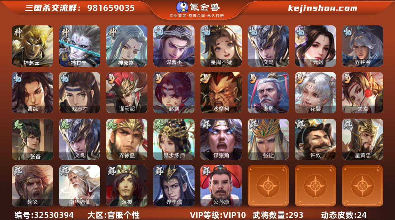 【1600】官阶:骠骑将军;VIP等级:VIP10;史诗武将数量:30;动态皮肤数量:24;武将总数:293;史诗宝珠数量:0;将魂数量:0;神将:5;魏国史诗武将:20;蜀国史诗武将:6;吴国史诗武将:3;群史诗武将:11
