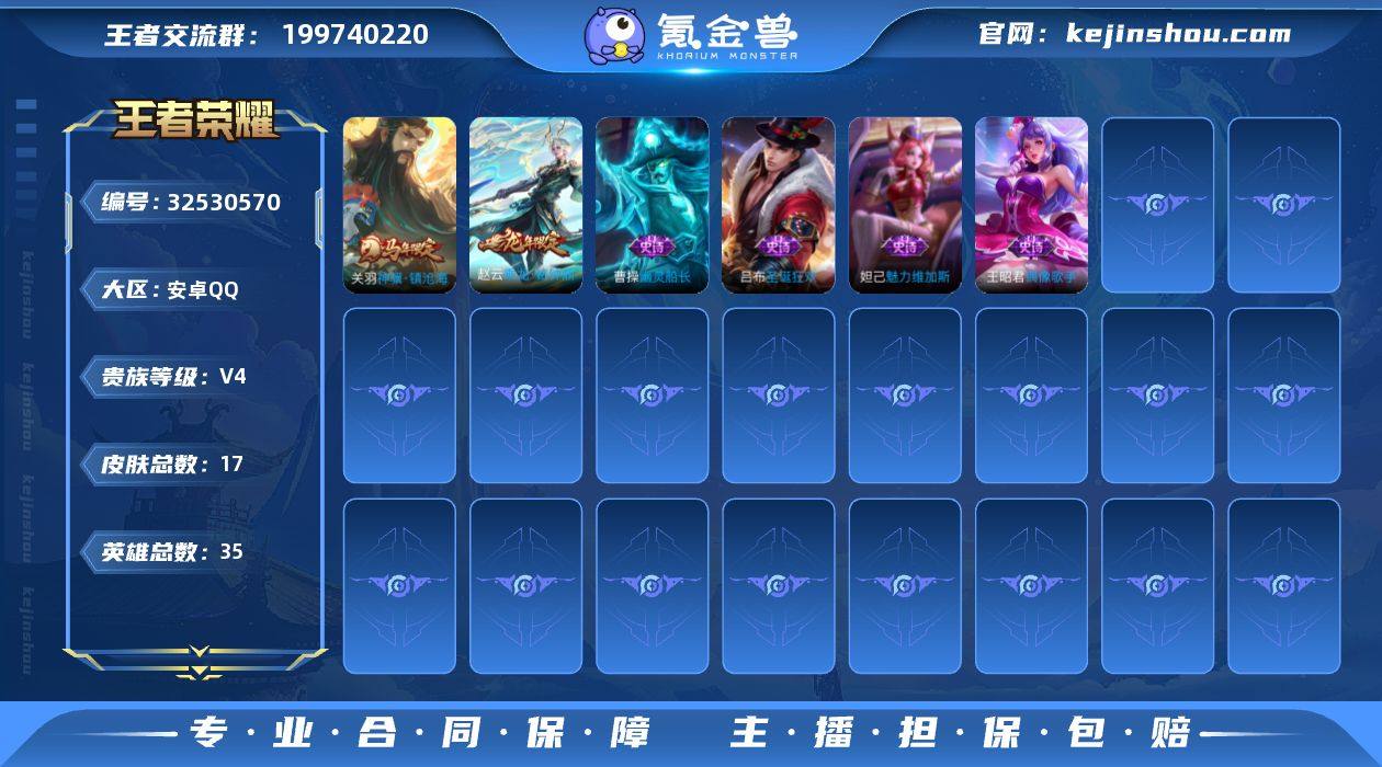 -V4-永恒钻石III-35英雄-17皮肤-2传说-4史诗 【稀有英雄】 赵云 【传说皮肤】 神骥·镇沧海 乘龙·铭钟鼎 【史诗皮肤】 魅力维加斯 偶像歌手 圣诞狂欢 幽灵船长 【勇者皮肤】 汉昭烈帝 鲨炮海盗猫 海滩派对 阿尔法小队 死亡骑士 玩偶对对碰 忍·炎影 万事如意 【其他皮肤】 龙域领主