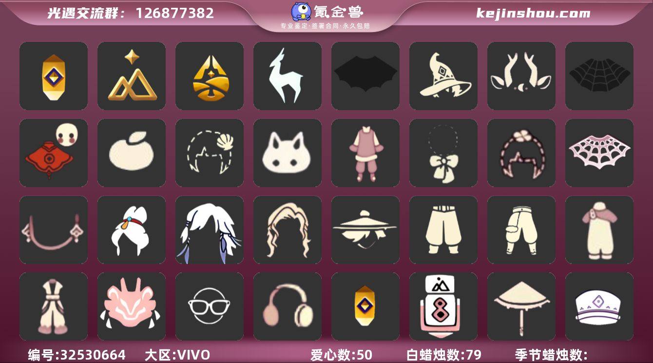 账号类型: 手机账号 季节已毕业: 追忆季,拾光季,归巢季,九色鹿季 完成地图: 雨林,霞谷 珍稀物品: 彩虹围巾 礼包: 蝙蝠套,巫师,九色鹿角,蜘蛛斗,福娃,橘子,贝壳,兔子,新年裤,蝴蝶结,四叶草,透明蛛丝,新年耳钉 裤子: 武士裤,背带裤,搓澡巾,飞天裤 面具: 夜行毕业面具 面饰: 红耳机,黑框眼镜 项链: 围巾 发型: 归巢毕业发型,若笠,虚荣,飞天盘发 头饰: 牛仔帽,蓝色音乐会,平顶帽 斗篷: 绿芽 配饰: 雨伞,相机,鲲灯 亮点: 【优质装备】:武士裤,归巢毕业发型(五塑彩羽发),追忆季,牛仔帽(西部帽),相机(季卡相机),拾光季,彩虹围巾(五塑彩带斗),归巢季,九色鹿(九色鹿季),飞天裤(柔缎花边连)(九色鹿丝带裤),围巾(肩带),夜行毕业面具(棕熊面具),黑框眼镜(粗框眼镜),鲲灯(追忆之书),飞天盘发(九色鹿丸子头),蝙蝠套(蝙蝠斗篷)(南瓜头),福娃(福娃礼包)(春之日礼包)(铜钱斗),红耳机,九色鹿角(神鹿祝福头饰)(神鹿祝福礼包),蜘蛛斗(蛛丝斗篷)(蛛网斗篷),巫师(巫师帽),新年裤(瑞气服饰),雨林,霞谷,若笠(箬笠),透明蛛丝(透明蜘蛛斗),蝴蝶结(大蝴蝶结),兔子(玉兔头饰)(玉兔发饰)(兔子发饰),新年耳钉(金鳞耳饰),橘子(大橘大利),贝壳(贝壳发饰),四叶草(四叶草头饰)