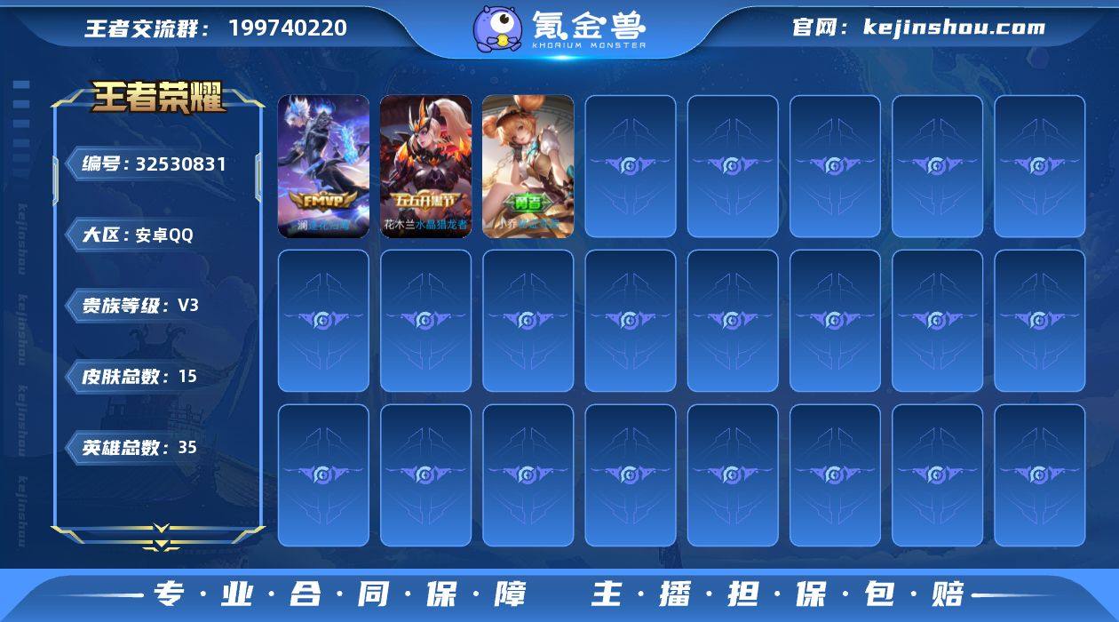 JJ4308:安卓Q-V3-尊贵铂金II-35英雄-15皮肤-0典藏-0无双-0珍品传说-1传说-1史诗 【稀有英雄】 不知火舞 赵云 【传说皮肤】 逐花归海 【史诗皮肤】 水晶猎龙者 【勇者皮肤】 黄金武士 古海寻踪 死亡骑士 掌控之力 探海日志 【其他皮肤】 灼热之刃 西部大镖客 威尼斯狂欢 创世神祝 孤猎 赤焰之缨