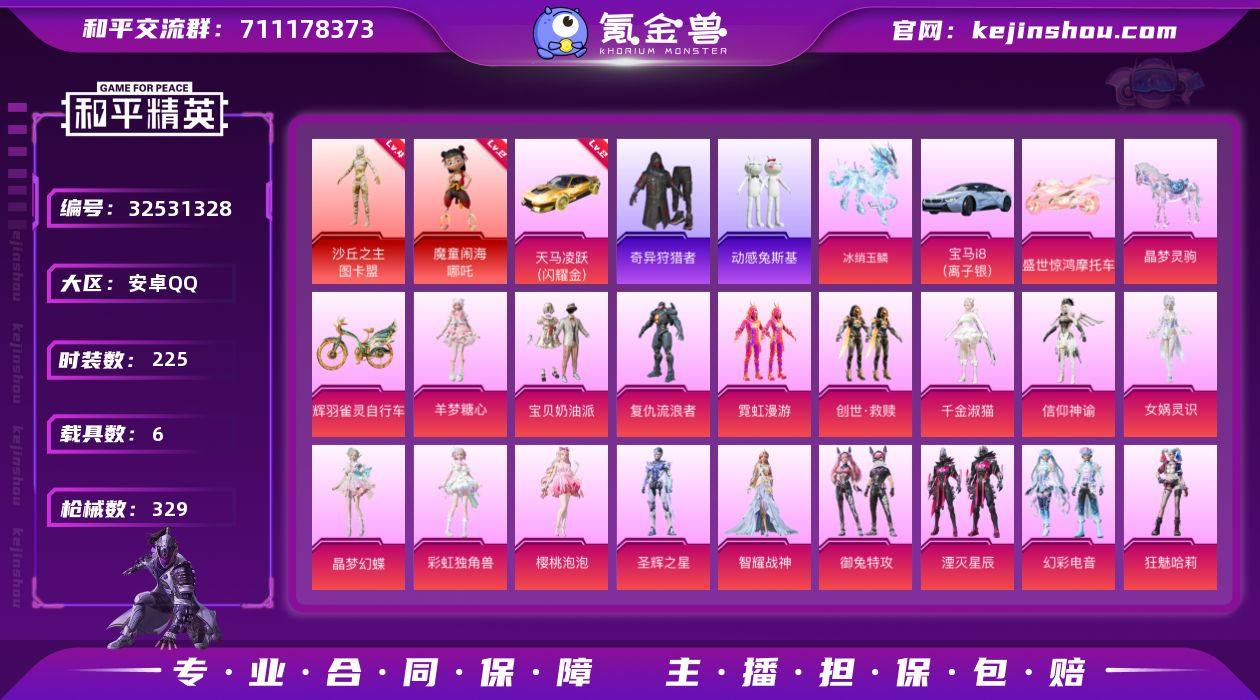 安卓 手Q-2神装-20粉装-18特效枪-6载具-14粉色飞行器-122144热力值-14王牌印记-225套装-329枪皮 【红色载具】:天马凌跃(闪耀金)(二级) 【红色神装等级】:魔童闹海-哪吒(二级),沙丘之主-图卡盟(四级) 【红色角色神装】:魔童闹海-哪吒,沙丘之主-图卡盟 【热门品类】:套装-小丑鱼,套装-奇异狩猎者,套装-动感兔斯基人偶服,套装-龟仙人,套装-粉红小猪,套装-红红火火 【粉色套装】:粉装-宝贝奶油派,角色-复仇流浪者,粉装-霓虹漫游,套装-创世·救赎,角色-千金淑猫,角色-信仰神谕,角色-女娲灵识,角色-晶梦幻蝶,角色-彩虹独角兽,角色-樱桃泡泡,角色-圣辉之星,角色-智耀战神,粉装-御兔特攻,粉装-湮灭星辰,粉装-幻彩电音,角色-狂魅哈莉,角色-狂魇小丑,角色-罗征,角色-羊梦糖心 【粉色枪皮等级】:M416-至情至圣(九级),M416-墨龙九天(三级),GROZA-镜光银凌(五级),AUG-许七安(五级),AUG-暖羊咩咩(五级),AKS-74U-信仰神谕(六级),Kar98K-巳巳如意(五级),Kar98K-圣域龙灵(二级),AWM-湮灭星辰(六级),Mk14-盛世惊鸿(二级),Mk14-樱桃泡泡(一级),AMR-智耀战神(三级),M200-伏羲圣卦(五级),DP-28-千金淑猫(一级),DP-28-豹影疾电(五级),MG-36-幻彩电音...