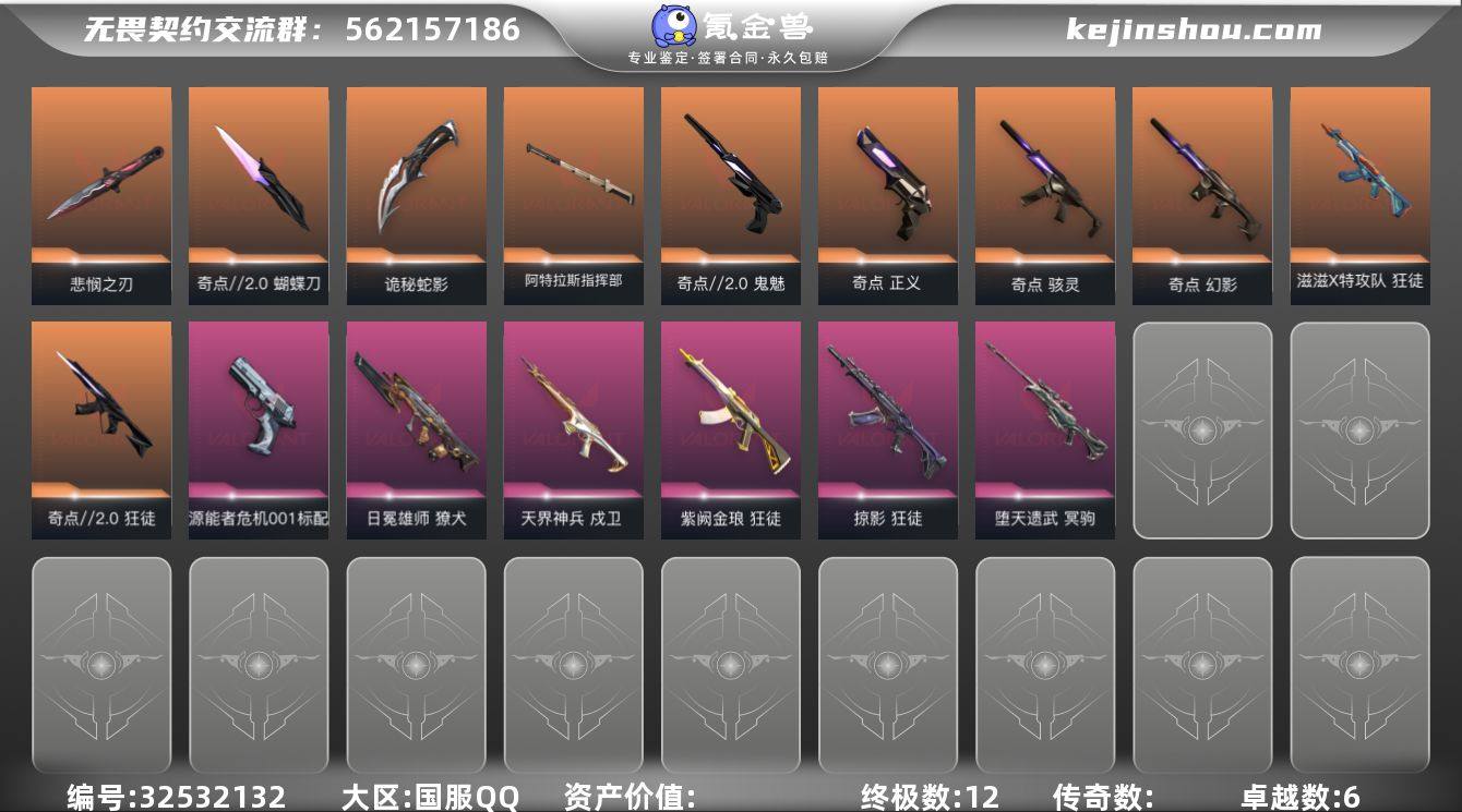 【2.8w库存怜悯之刃.奇点2.0套装.太刀.四狂徒水枪.紫金.掠夺.天界戍卫.弃王狙】YXy5368【无二次】【因赛季更新游戏段付以上号为准!】 【套装】:无畏契约季前邀请赛套装,奇点//2.0套装,回火礼包:奇点套装 【英雄】:幻棱,炼狱,维斯,暮蝶,钛狐,壹决,铁臂,捷风,雷兹,幽影,不死鸟,贤者,猎枭,蝰蛇,零,芮娜,奇乐,尚勃勒,霓虹,斯凯,夜露,星礈,K/O,盖可,黑梦 【近战武器】:近战武器-无畏契约季前邀请赛 悲悯之刃,近战武器-奇点//2.0 蝴蝶刀,近战武器-鬼丸国纲,近战武器-诡秘蛇影 军刀,近战武器-阿特拉斯指挥部 甩棍 【狂徒】:狂徒-奇点//2.0,狂徒-滋滋X特攻队,狂徒-掠影,狂徒-紫阙金琅,狂徒-诡秘蛇影 【幻影】:幻影-奇点,幻影-末日之翼 【戍卫】:戍卫-天界神兵,戍卫-折光棱晶 【獠犬】:獠犬-日冕雄师 【冥驹】:冥驹-堕天遗武 【飞将】:飞将-末日之翼 【莽侠】:莽侠-诡秘蛇影 【奥丁】:奥丁-末日之翼 【判官】:判官-诡秘蛇影 【骇灵】:骇灵-奇点,骇灵-无限竞技 【蜂刺】:蜂刺-折光棱晶 【标配】:标配-源能者危机001,标配-折光棱晶 【正义】:正义-奇点 【鬼魅】:鬼魅-奇点//2.0,鬼魅-诡秘蛇影 【短炮】:短炮-末日之翼 【卡面...