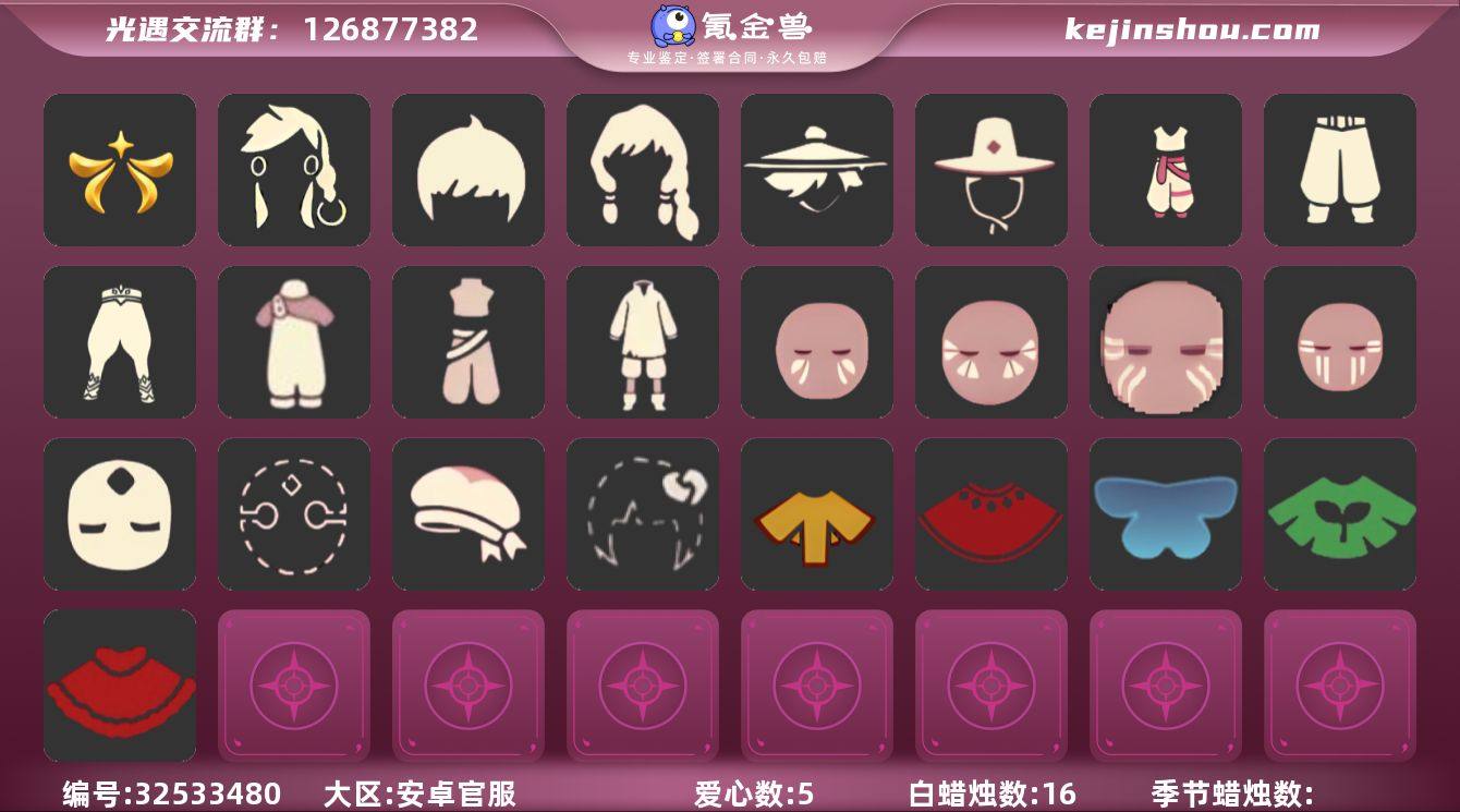 编号AY340-340 安卓手机 换绑CD4.20 详情请看衣柜截图 蜡烛数:16 爱心数:5 季节已毕业:欧若拉季 珍稀物品:透明蝶翼斗 裤子:背带裤 白色背心套装 蓝绿裤 乞丐裤 武士裤 灯笼裤 鞋子:毛靴裤 面具:矮人面具 红色条纹面具 蓝色条纹面具 白色条纹面具 绿色条纹面具 黑脸 发型:书虫 正太 明制 若笠 吊环双辫发型 头饰:贝雷帽 合服头饰 斗篷:红金 黄色蓑衣 透明蓝蝴蝶 绿芽 圣诞斗 配饰:尤克里里 当前身高(可爱) 13.139279990609989 预计最高可达 1.83533729478343 预计最矮可到 13.835337294783429