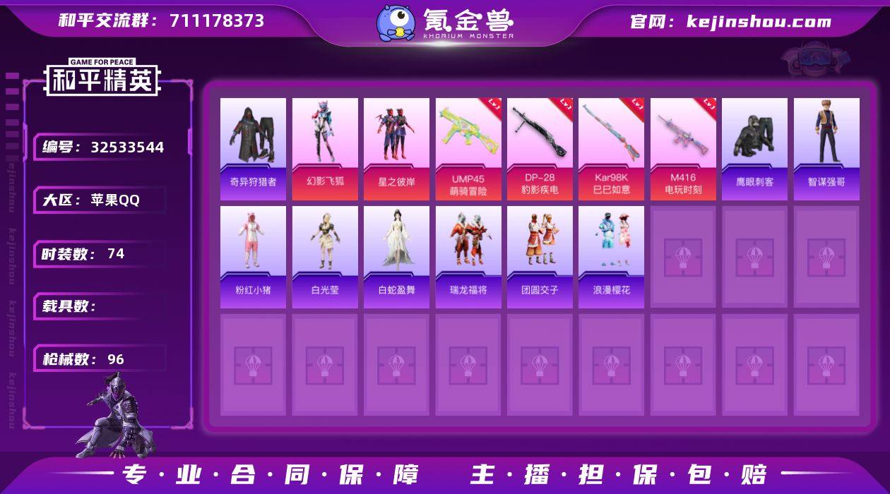 【2粉装】幻影飞狐,星之彼岸【5特效枪】Mk14-福马献瑞[5级],DP-28-豹影疾电[5级],M416-电玩时刻[5级],Kar98K-巳巳如意[3级],UMP45-萌骑冒险[5级]【2稀有】奇异狩猎者,AWM-黄金龙骨【4飞行器】炫彩糖果飞行器,拂晓神骑飞行器,星之彼岸飞行器,粉色滑翔尾迹【2头盔】金羽特工头盔,幻影战神头盔【2背包】金羽特工背包,深海小丑鱼背包【161其它衣服和枪皮】黄色伏地魔,猛禽,瑞龙福将,角色-白光莹,冰河战士,红釉青花,耀眼新星,海盐绵绵冰,蓝彩潮人,魅力单车,鹤鸣,热情海星,黄色运动,竞技勇士朋克,音速流光,娇憨猪猪,SS29特训,炫蓝之夏,长空猛禽,SS18特训,空投萌叽,角色-Mark.06,炫彩糖果,鹰眼刺客,龙魂突击队,SS21特训,SS27特训,红色运动,SS22特训,星梦畅游,纯真浪花,SS7特训,酷潮明星,猎鹰,海龙战士,战术大师,云霞荷露,SS34特训,飞驰魅影,蓝色运动,都市漫游者,夏日音浪,粉红小猪,霓虹街区,SS31特训,浪漫樱花,湖蓝色名流,黄色名流,蓝色守护者,燕燕于飞,旋风灵鼠,SS20特训,萌趣咩咩,街头潮人,SS17特训,竞技名士,青涩时光,狙击之神,SS35特训,...