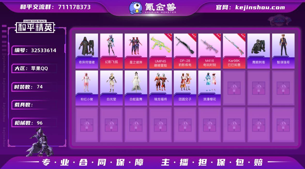 【2粉装】幻影飞狐,星之彼岸【5特效枪】Mk14-福马献瑞[5级],DP-28-豹影疾电[5级],M416-电玩时刻[5级],Kar98K-巳巳如意[3级],UMP45-萌骑冒险[5级]【2稀有】奇异狩猎者,AWM-黄金龙骨【4飞行器】炫彩糖果飞行器,拂晓神骑飞行器,星之彼岸飞行器,粉色滑翔尾迹【2头盔】金羽特工头盔,幻影战神头盔【2背包】金羽特工背包,深海小丑鱼背包【161其它衣服和枪皮】黄色伏地魔,猛禽,瑞龙福将,角色-白光莹,冰河战士,红釉青花,耀眼新星,海盐绵绵冰,蓝彩潮人,魅力单车,鹤鸣,热情海星,黄色运动,竞技勇士朋克,音速流光,娇憨猪猪,SS29特训,炫蓝之夏,长空猛禽,SS18特训,空投萌叽,角色-Mark.06,炫彩糖果,鹰眼刺客,龙魂突击队,SS21特训,SS27特训,红色运动,SS22特训,星梦畅游,纯真浪花,SS7特训,酷潮明星,猎鹰,海龙战士,战术大师,云霞荷露,SS34特训,飞驰魅影,蓝色运动,都市漫游者,夏日音浪,粉红小猪,霓虹街区,SS31特训,浪漫樱花,湖蓝色名流,黄色名流,蓝色守护者,燕燕于飞,旋风灵鼠,SS20特训,萌趣咩咩,街头潮人,SS17特训,竞技名士,青涩时光,狙击之神,SS35特训,...
