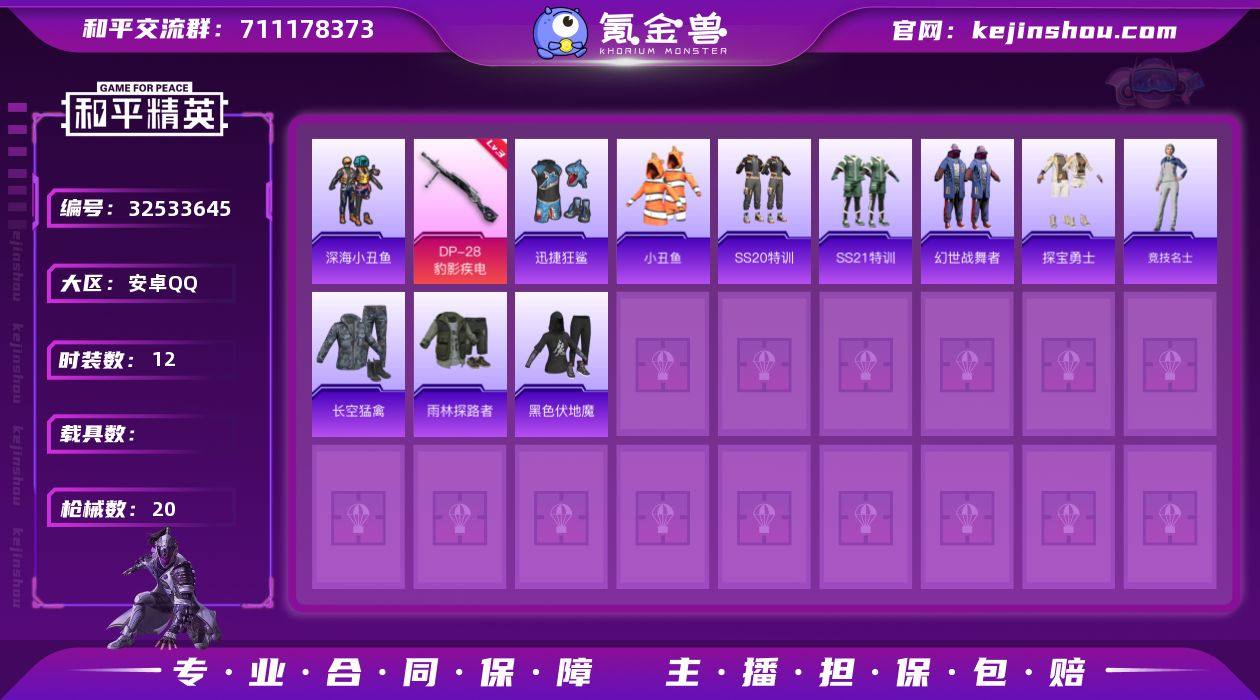 【FK6620】12套装/枪械1/装备8/战备16/热力值3675/三级DP-28-豹影疾电/深海小丑鱼/小丑鱼/DP-28-豹影疾电/圣堂之誓降落伞/M16A4-幻世战舞者/M416-红色方程式/M416-蓝色火焰/AUG-耀粉歌者/UMP45-生命誓言/UMP45-蓝色火焰/Kar98K-彩虹符号/S1897-炫彩节奏/S12K-破晓战魂/S12K-幻世战舞者/MG3-幻世战舞者/SS20特训/SS21特训/幻世战舞者/探宝勇士/竞技名士/长空猛禽/雨林探路者/黑色伏地魔/迅捷狂鲨/幻影战神头盔(1级)